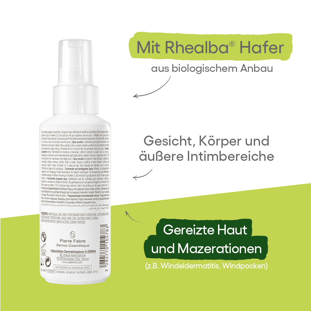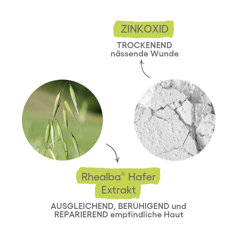 Pflanzenbasierte feuchtigkeitsabsorbierende und beruhigende Pflege bei nässenden Hautirritationen als Spray für eine schmerzlose Anwendung.