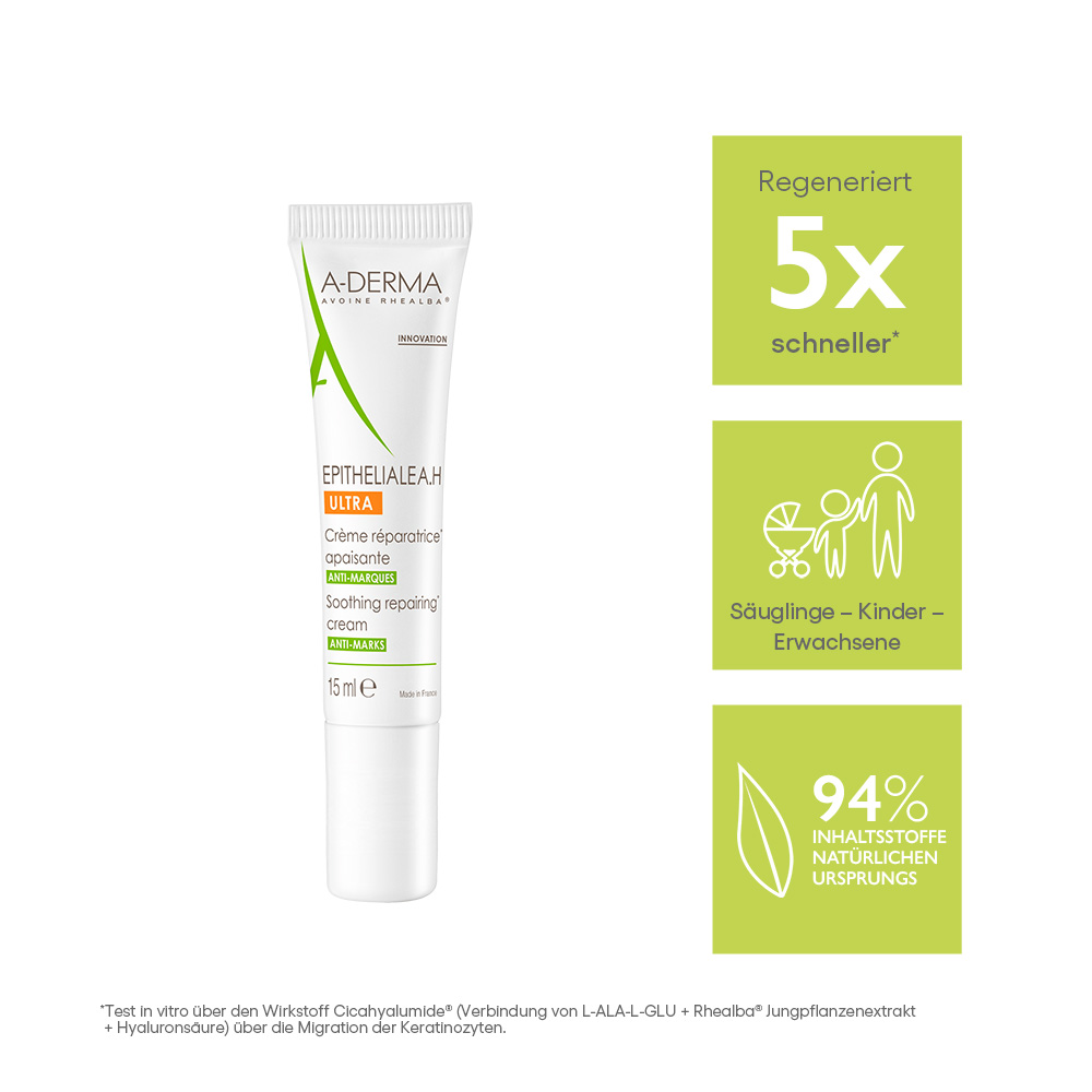 Dank des patentierten*** exklusiven Aktivstoffs Cicahyalumide® und des enthaltenen Uncaria tomentosa-Extraktes wirkt die innovative Formulierung EPlTHELIALE A.H ULTRA dreifach: Spendet Feuchtigkeit und fördert eine schnelle und ästhetische Regeneration der Haut, beugt Narben vor, beruhigt sofort und lang anhaltend unangenehme Hautempfindungen.