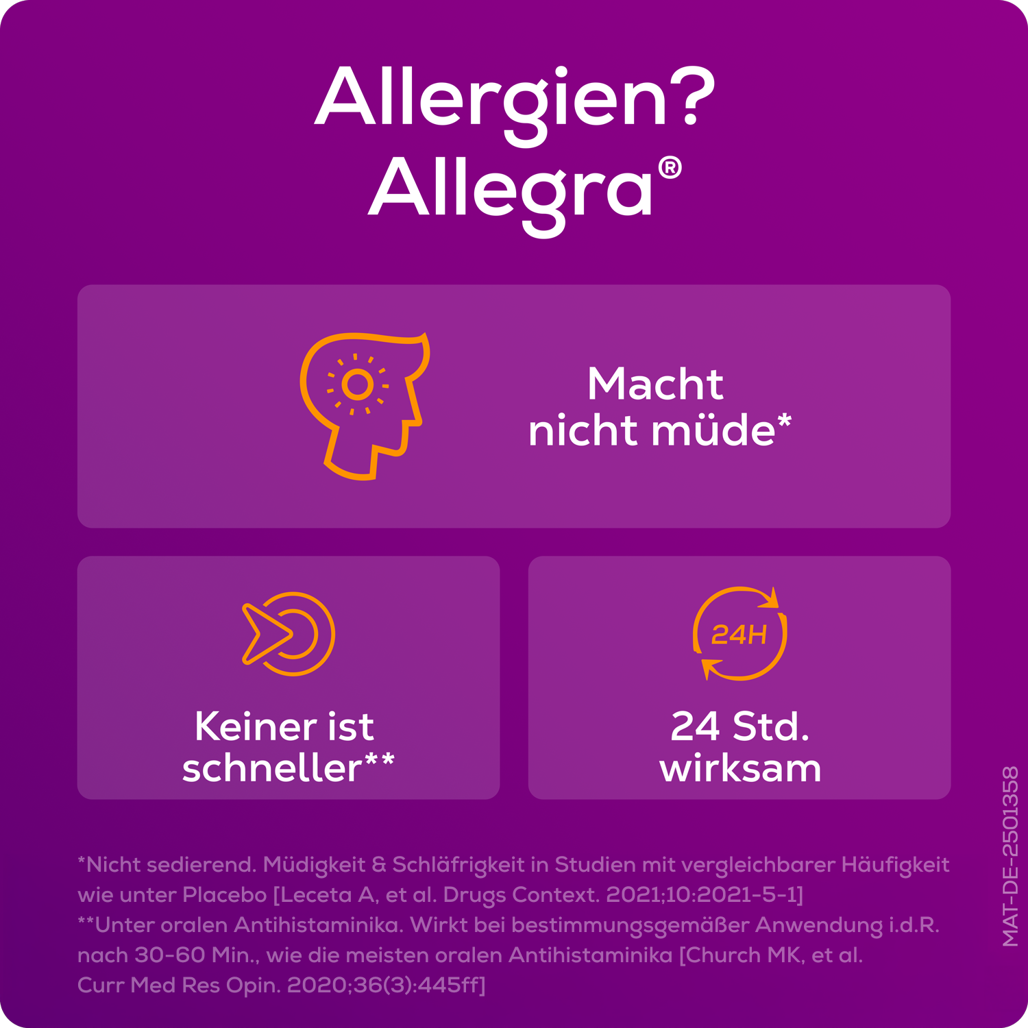 Allegra® Allergietabletten mit dem Wirkstoff Bilastin, ist ein Antihistaminikum der jüngsten Generation. Allegra® lindert wirksam allergisch bedingte Symptome wie Niesen, tränende Augen sowie Juckreiz, Rötung und Quaddelbildung. Allegra® kann bei verschiedenen Allergien angewendet werden, z.B. bei Heuschnupfen (Pollen-Allergie), Hausstaubmilben-Allergie, Tierhaar-Allergie, Schimmelpilz-Allergie sowie Urtikaria (Nesselsucht).