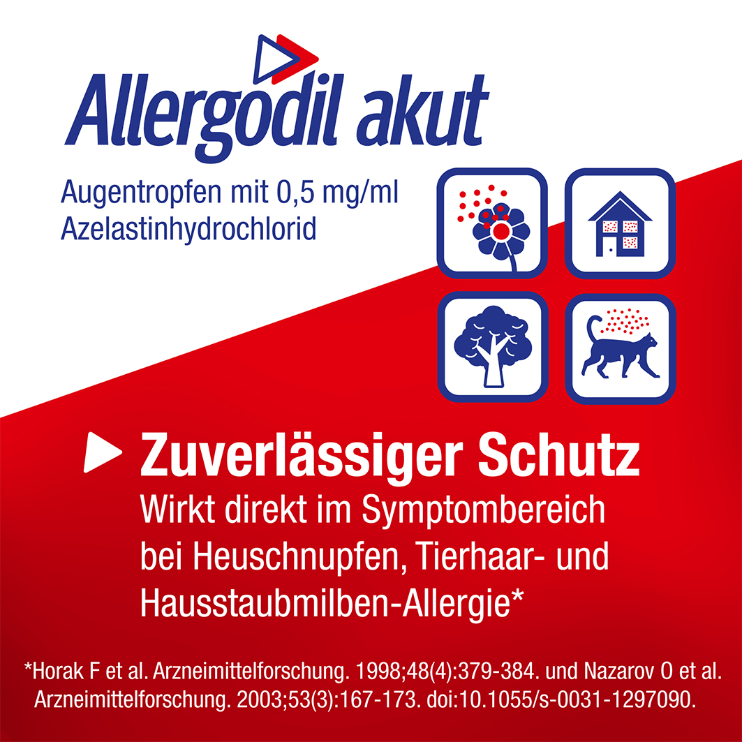 - ANTIALLERGISCHE AUGENTROPFEN: Die Allergodil akut Augentropfen werden bei saisonalen Allergien (Heuschnupfen) ab 4 Jahren sowie bei nicht-saisonalen Allergien (Hausstaubmilben, Tierhaare) ab 12 Jahren eingesetzt