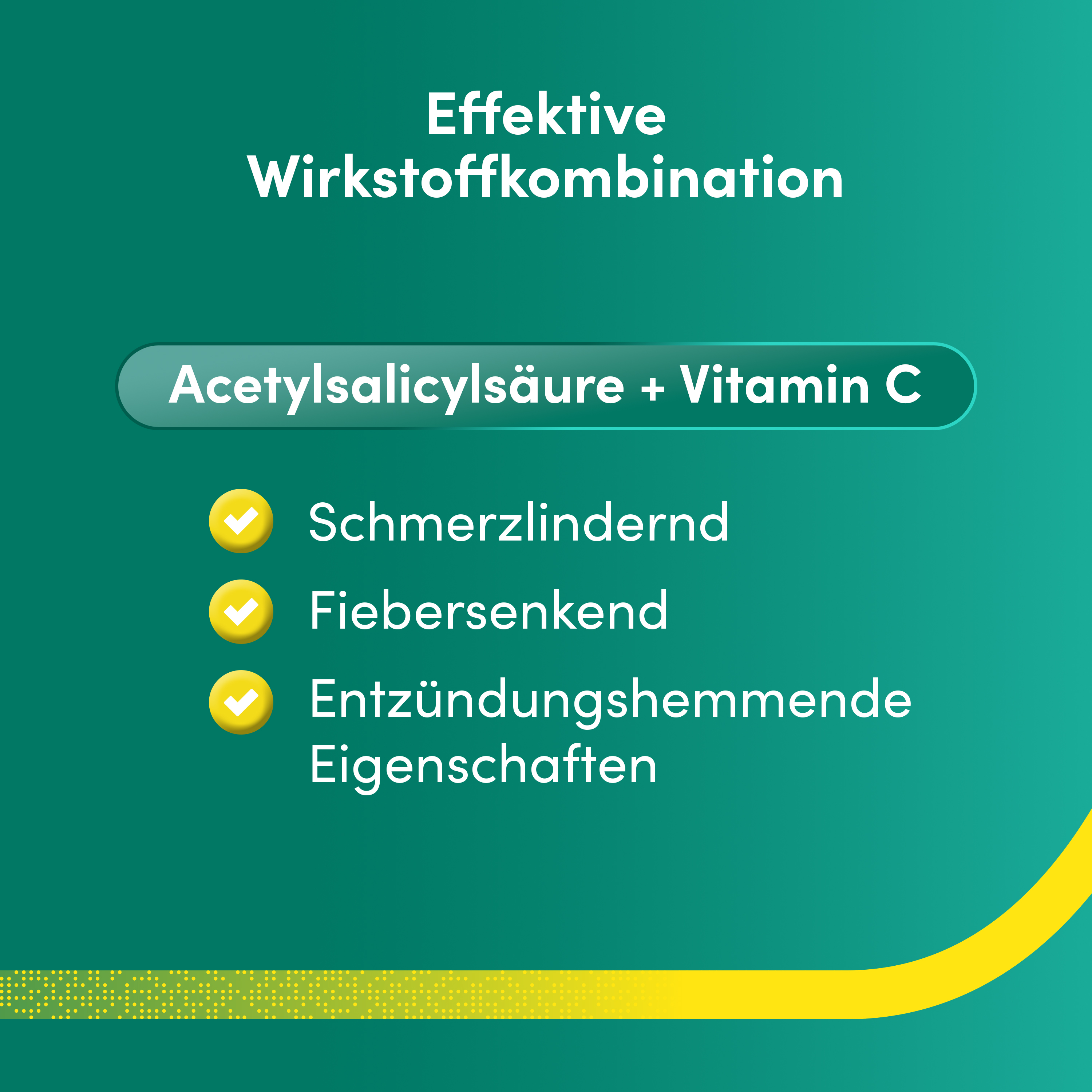 Das Arzneimittel besteht aus einer Wirkstoffkombination. Der Wirkstoff Acetylsalicylsäure wirkt schmerzstillend, fiebersenkend und entzündungshemmend zugleich. Er blockiert die Bildung bestimmter Botenstoffe im Körper, so genannte Prostaglandine. Diese sind an der Entstehung von Schmerzen, Fieber und Entzündungen wesentlich beteiligt.