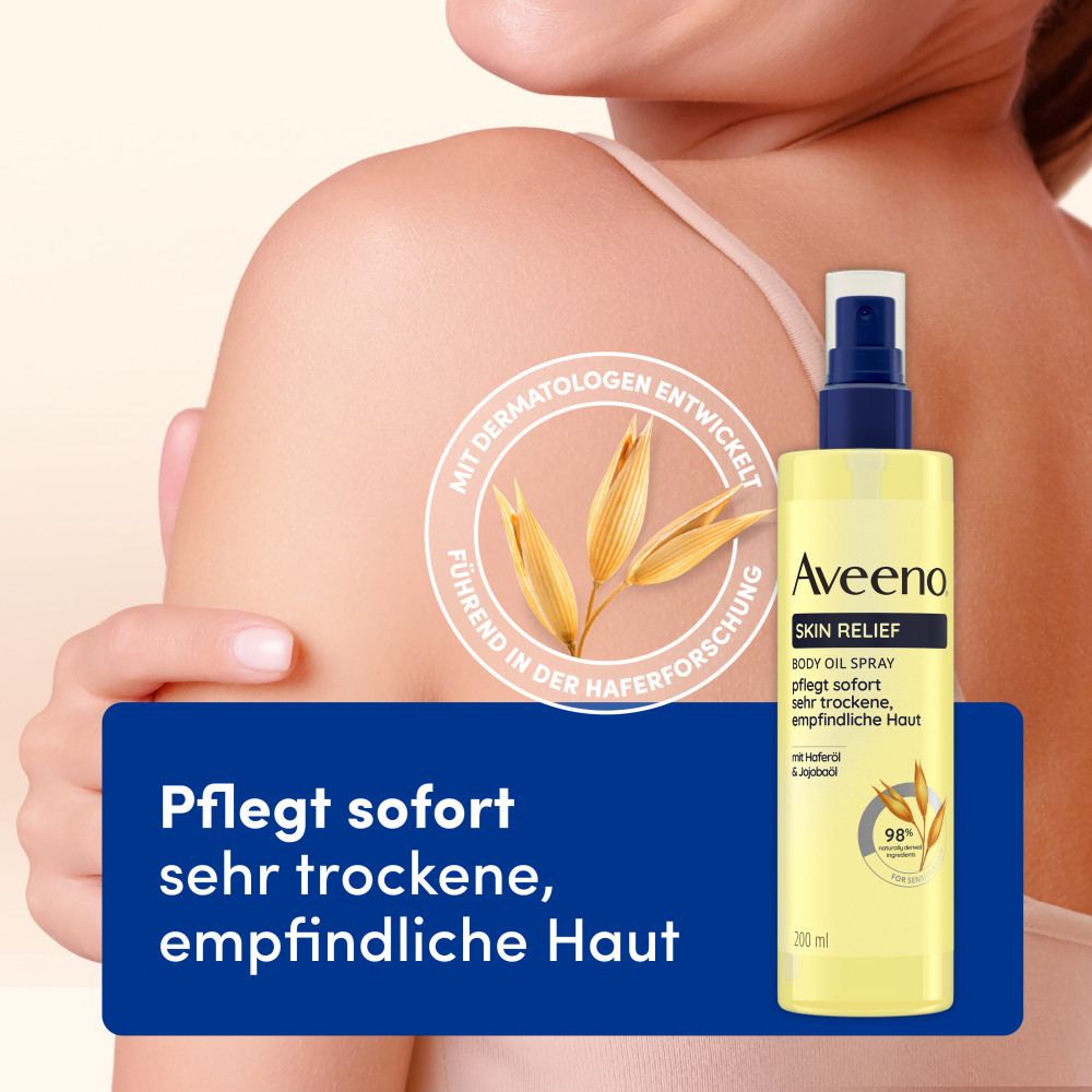 - Das Skin Relief Körperöl-Spray von Aveeno® versorgt selbst sehr trockene, empfindliche Haut mit intensiver & langanhaltender Feuchtigkeit und pflegt die Haut nachhaltig.