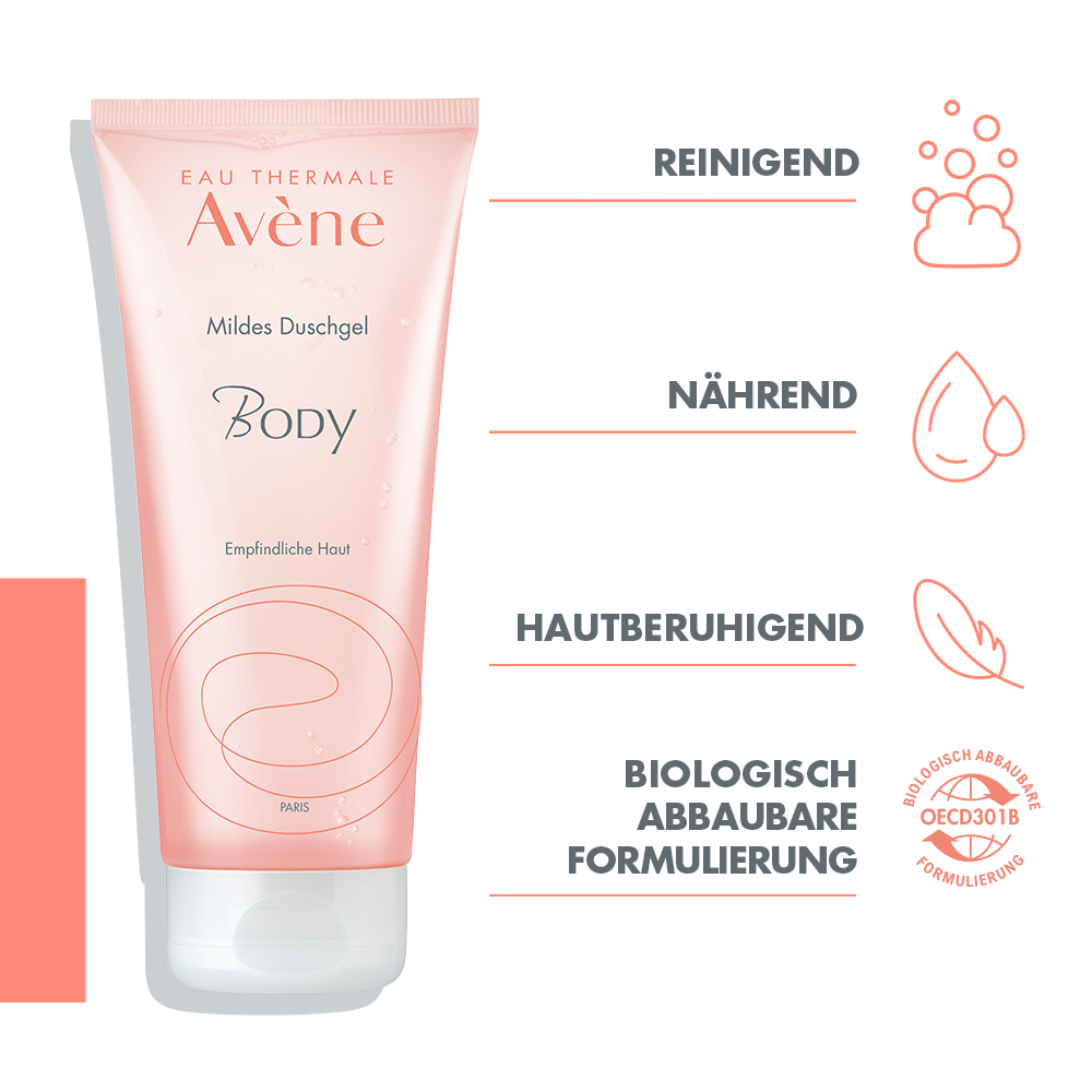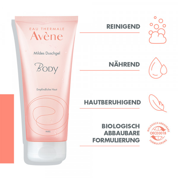 Das Duschgel erzeugt einen zarten Duschschaum mit angenehmem Duft: BODY Mildes Duschgel eignet sich zur sanften Reinigung von Gesicht und Körper. Die seifenfreie Formel mit physiologischem pH-Wert und einem Drei-Pflanzenöl-Komplex reinigt, beruhigt und hydratisiert die Haut. Sehr gut verträglich für Augen, Haut und Intimbereich. Auch als Badezusatz geeignet.