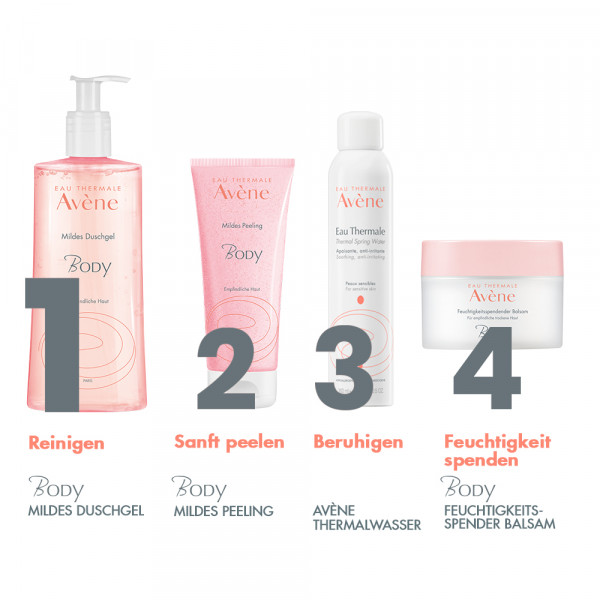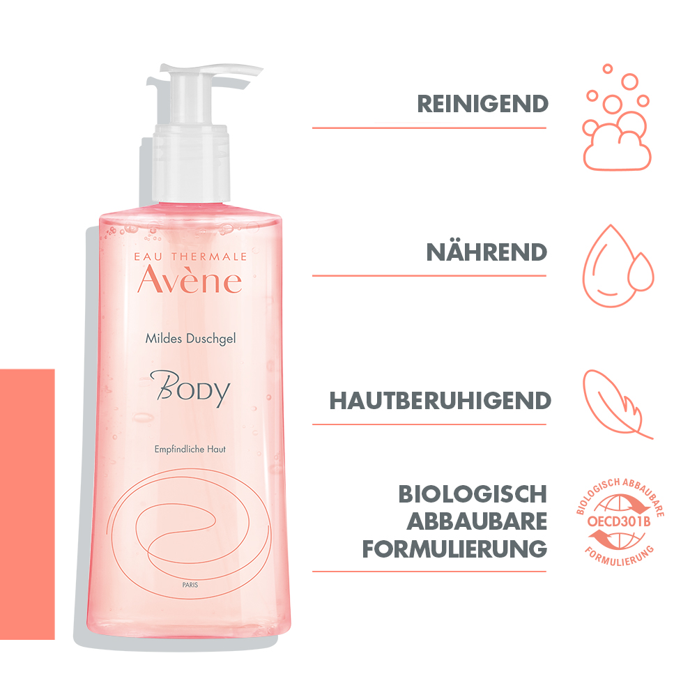 Das Duschgel erzeugt einen zarten Duschschaum mit angenehmem Duft: BODY Mildes Duschgel eignet sich zur sanften Reinigung von Gesicht und Körper. Die seifenfreie Formel mit physiologischem pH-Wert und einem Drei-Pflanzenöl-Komplex reinigt, beruhigt und hydratisiert die Haut. Sehr gut verträglich für Augen, Haut und Intimbereich. Auch als Badezusatz geeignet.