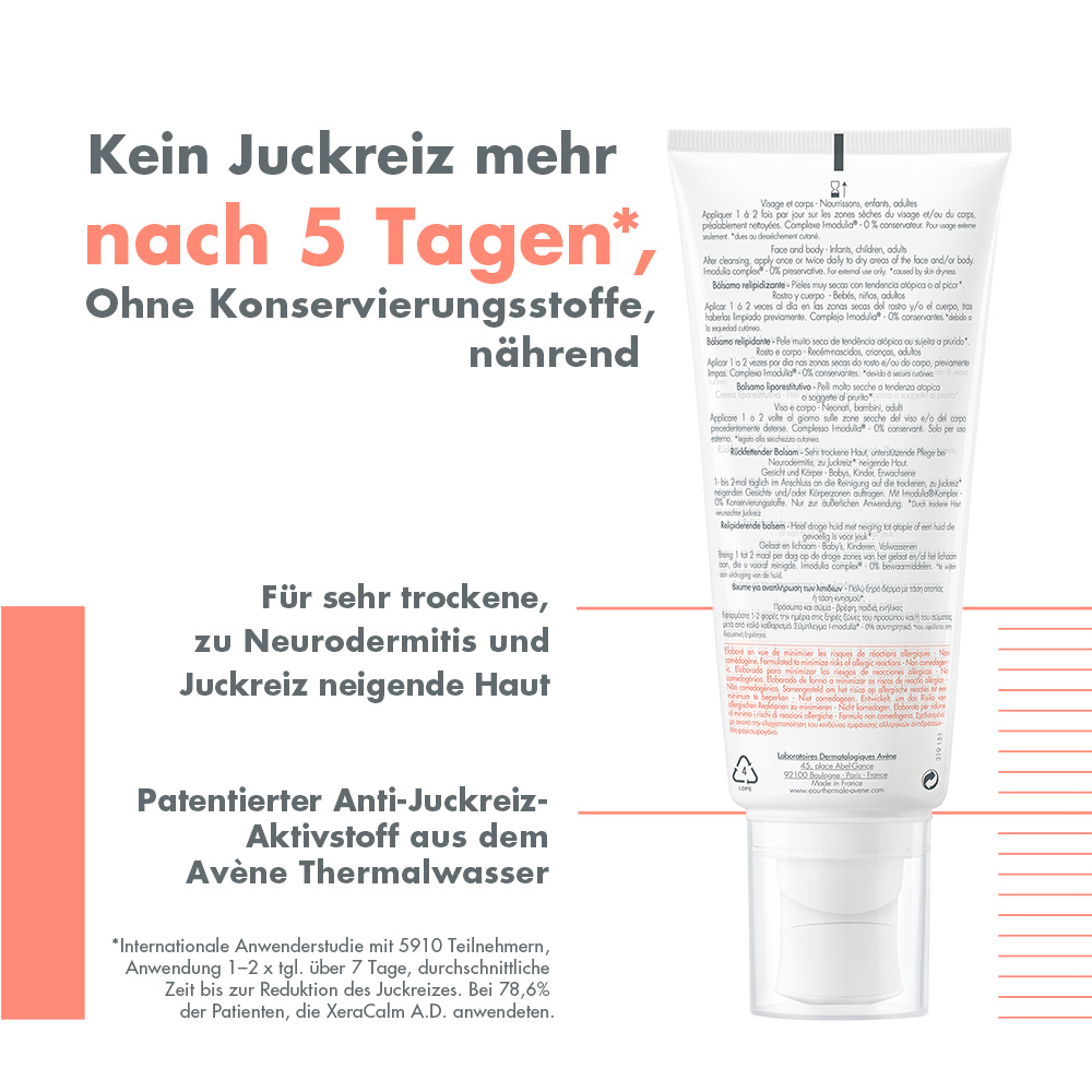 Die Haut wird durch die Anwendung des XeraCalm A.D Balsam gepflegt und mit Feuchtigkeit versorgt. Er beruhigt die Haut intensiv und sorgt dafür, dass die therapiefreien Intervalle bei atopischen Hautzuständen verlängert werden.