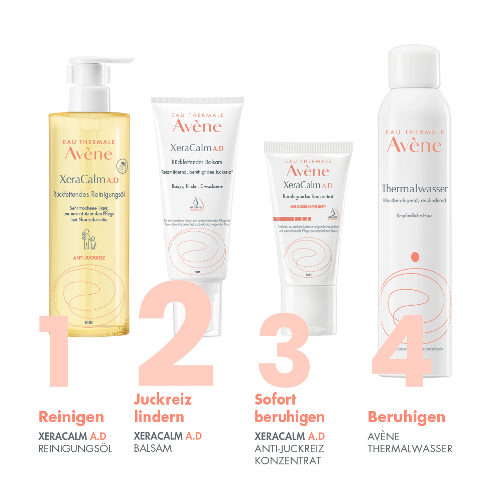Die Wirkung von XeraCalm A.D beruht auf einer einzigartigen Aktivstoff-Kombination. Grundlage ist das bewährte Avène Thermalwasser mit seinen hautberuhigenden, reizlindernden und entzündungshemmenden Eigenschaften. Ein CER-OMEGA-Lipidkomplex mit ungesättigten Omega-6-Fettsäuren stärkt die Hautbarriere, nährt die Haut und fördert ihre Regeneration. Das Herzstück von XeraCalm A.D ist der innovative Aktivstoff I-modulia®, der in intensiver wissenschaftlicher Forschung aus der Mikroflora des Avène Thermalwassers (Aquaphilus dolomiae) entwickelt wurde. Er lindert den durch Trockenheit verursachten Juckreiz, beruhigt Rötungen und stimuliert die Immunabwehr der Haut, um bakteriellen Superinfektionen entgegenzuwirken.