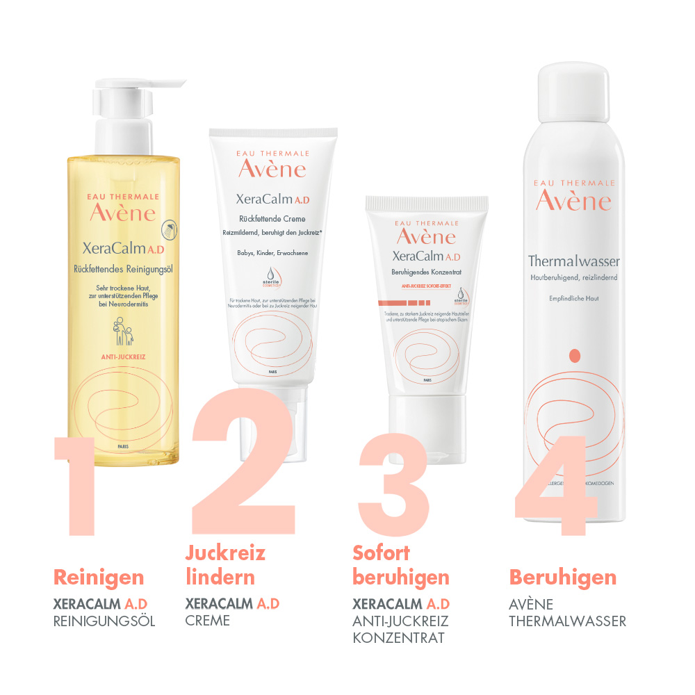 Die Wirkung von XeraCalm A.D beruht auf einer einzigartigen Aktivstoff-Kombination. Grundlage ist das bewährte Avène Thermalwasser mit seinen hautberuhigenden, reizlindernden und entzündungshemmenden Eigenschaften. Ein CER-OMEGA-Lipidkomplex mit ungesättigten Omega-6-Fettsäuren stärkt die Hautbarriere, nährt die Haut und fördert ihre Regeneration. Das Herzstück von XeraCalm A.D ist der innovative Aktivstoff I-modulia®, der in intensiver wissenschaftlicher Forschung aus der Mikroflora des Avène Thermalwassers (Aquaphilus dolomiae) entwickelt wurde. Er lindert den durch Trockenheit verursachten Juckreiz, beruhigt Rötungen und stimuliert die Immunabwehr der Haut, um bakteriellen Superinfektionen entgegenzuwirken.