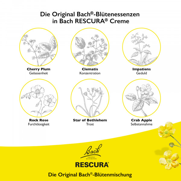 Juckende oder trockene Haut benötigt Zuwendung und Pflege. Ob emotionale Anforderungen, Wintertrockenheit oder Hitze im Sommer - wenn es unserer Haut nicht gut geht, geht es uns auch nicht gut. Deshalb wurde die Bach RESCURA® Creme entwickelt - eine Hautcreme mit einer exklusiven Mischung aus der bewährten Original Bach®-Blütenmischung von Edward Bach kombiniert mit reinigenden Bachblüte Crab Apple (Holzapfel), handgepflückt aus seinem ursprünglichen Garten in England. Sie pflegt und beruhigt, z.B. beanspruchte Haut und Hautstellen. Diese 24-Stunden Pflege ist für die ganze Familie geeignet. Bach RESCURA® Creme ist eine nicht-fettende, intensive Feuchtigkeitspflege, die entwickelt wurde, um den Feuchtigkeitsgehalt der Haut wieder aufzufüllen und trockene, brüchige und empfindliche Haut zu beruhigen. Die geruchsneutrale 3-in-1 Feuchtigkeitspflege, die hilft Hände, Haut und Gesicht gegen Umwelteinflüsse und Stressfaktoren zu schützen. Für die ganze Familie geeignet. Parfüm- und lanolinfrei.