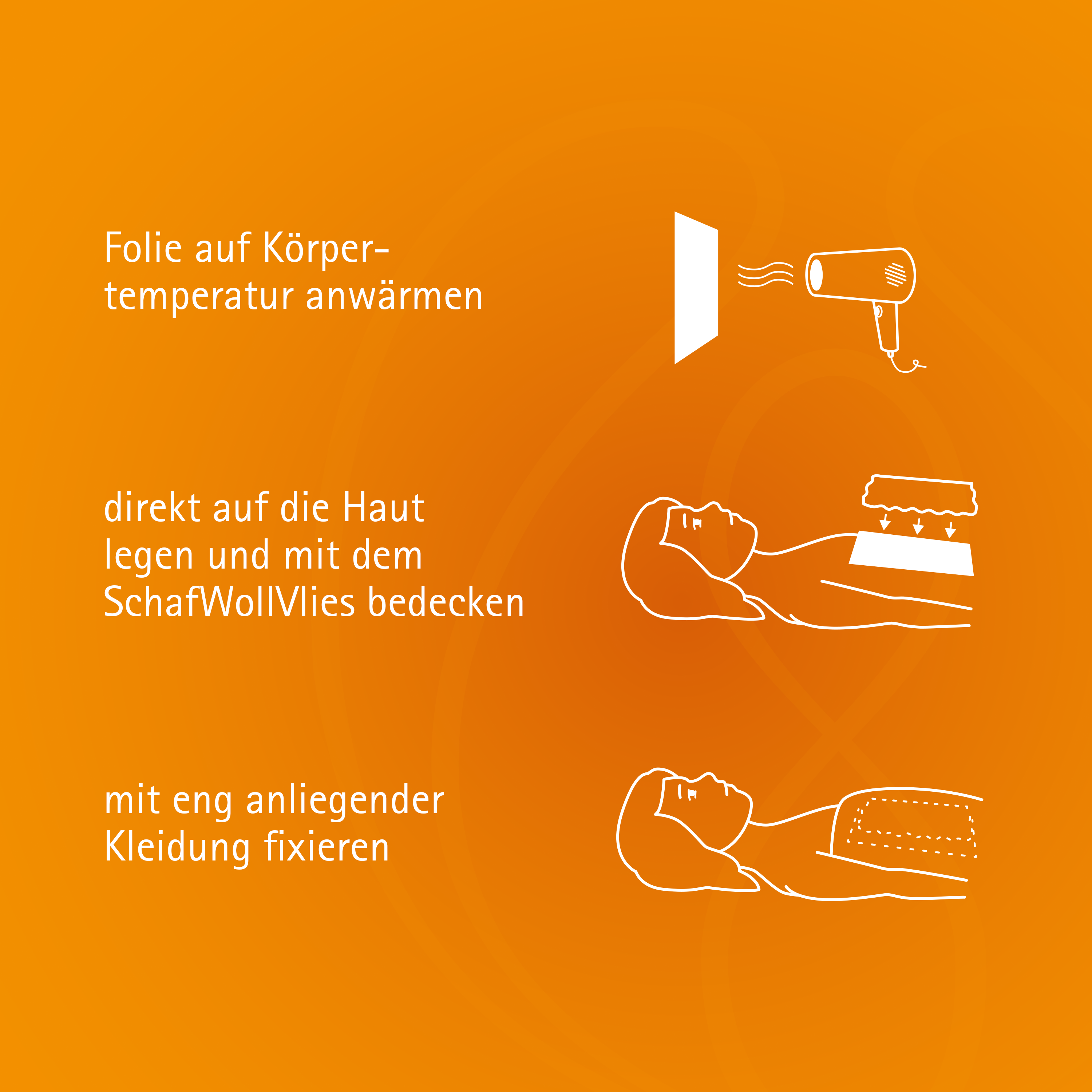 Eine Folie der Packung entnehmen und zwischen den Händen erwärmen. Die Folie auf das Bäuchlein legen und mit dem SchafWollVlies bedecken. Damit der Wickel an seinem Platz bleibt, kann er mit einem engen Hemdchen fixiert werden. Der Wickel darf täglich angewendet werden, am besten nach dem Stillen oder einer Mahlzeit und darf so lange liegen bleiben, bis das nächste Mal die Windel gewechselt wird.