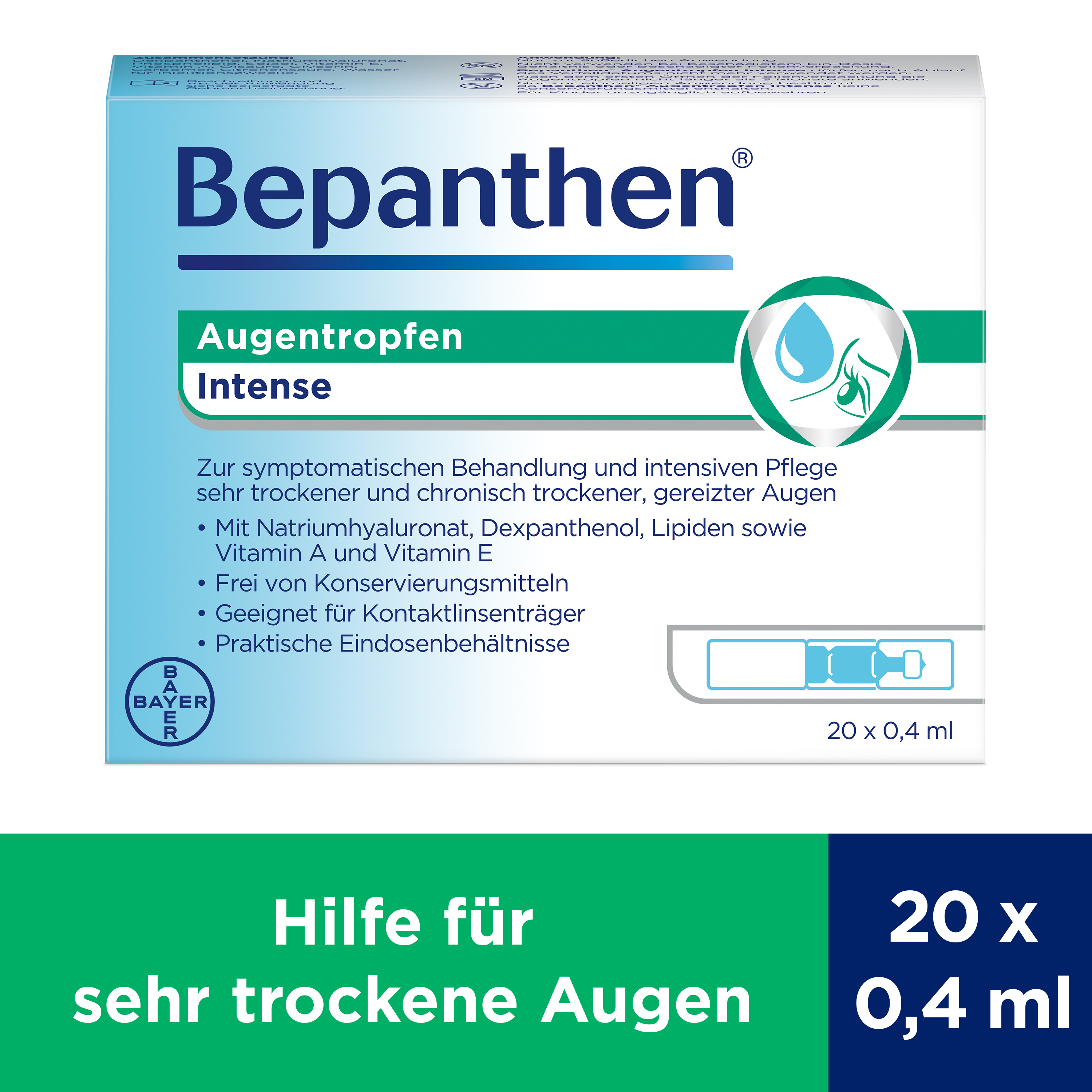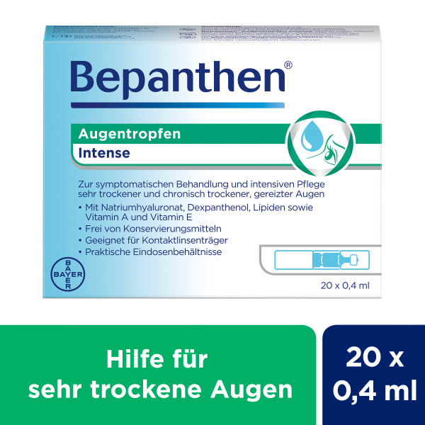 Die neuen Bepanthen® Augentropfen Intense bieten eine wirksame Hilfe bei sehr trockenen Augen oder chronisch trockenen Augen.  Durch die enthaltenen Inhaltsstoffe und den besonderen Lipid-Schutzschild-Komplex schützen Bepanthen® Augentropfen Intense vor der vorzeitigen Verdunstung des Tränenfilms und sorgen für eine langanhaltende Befeuchtung. Damit beruhigen Bepanthen® Augentropfen Intense sehr trockene Augen sowie chronisch trockene Augen und lindern die Beschwerden.