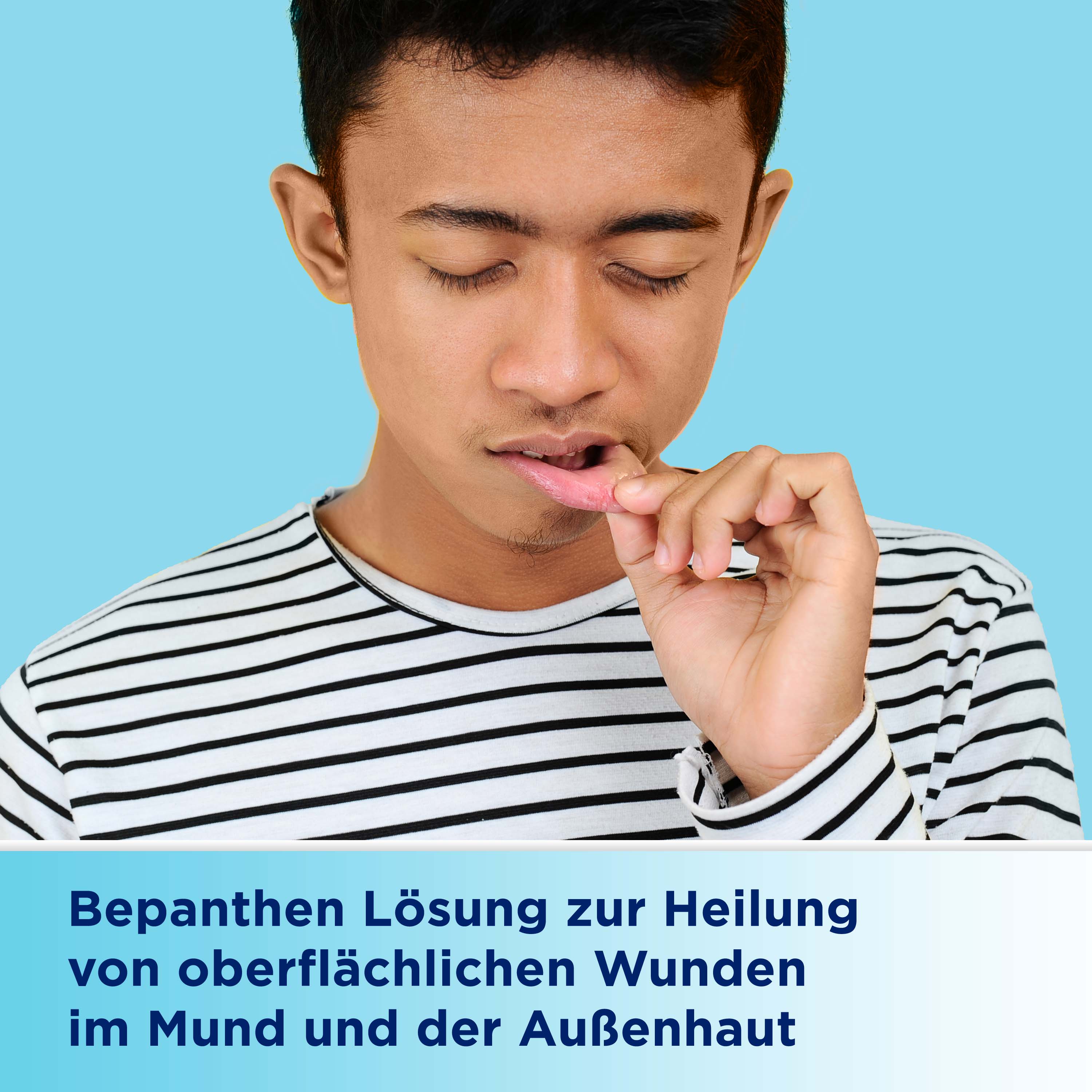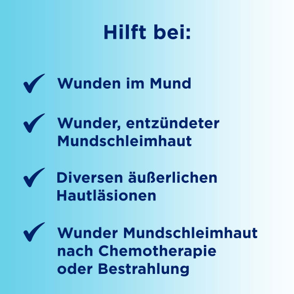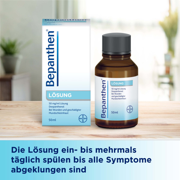 Unterstützen Sie die Wundheilung bei Mundschleimhautläsionen mit der Bepanthen® Lösung. Sie ist zur Anwendung als Spülung zum Beispiel im Mundbereich, aber auch bei oberflächlichen leichten Verletzungen der Außenhaut geeignet.