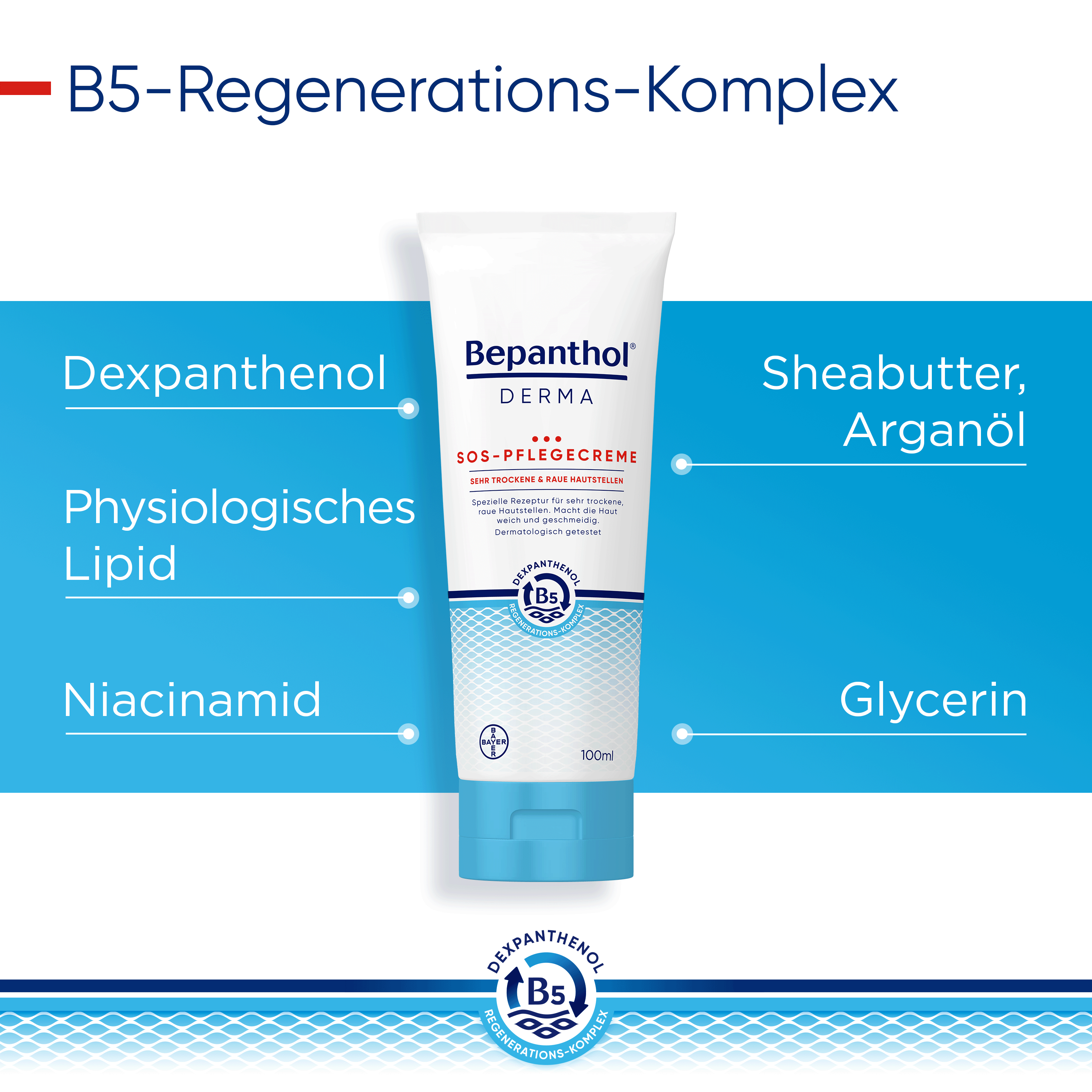 Der B5-Regenerations-Komplex unterstützt die Regeneration der Haut – von innen nach außen. Dabei fördert Dexpanthenol in tieferen Hautschichten der Epidermis die natürliche Zellregeneration. Das enthaltene Glycerin spendet sofortige und lang anhaltende Feuchtigkeit. Niacinamid (Vitamin B3) beruhigt juckende, trockene Haut und natürliche Lipide wie Sheabutter und Arganöl ergänzen fehlende Hautlipide. Das physiologische Lipid unterstützt zusätzlich die Anordnung der Doppellipidschicht.