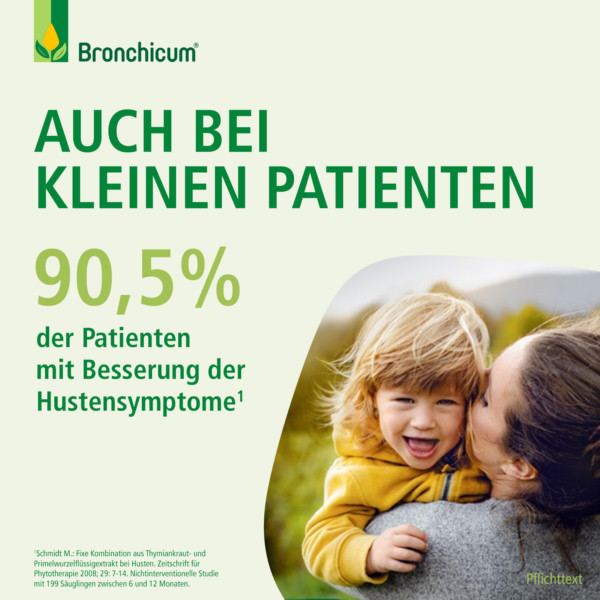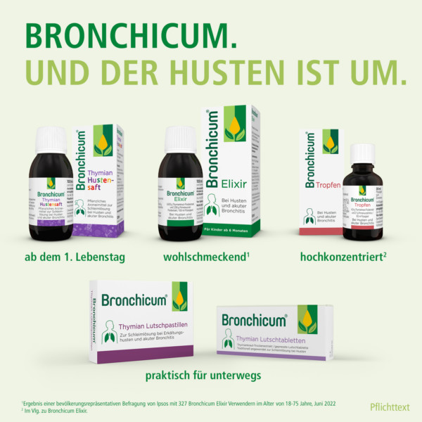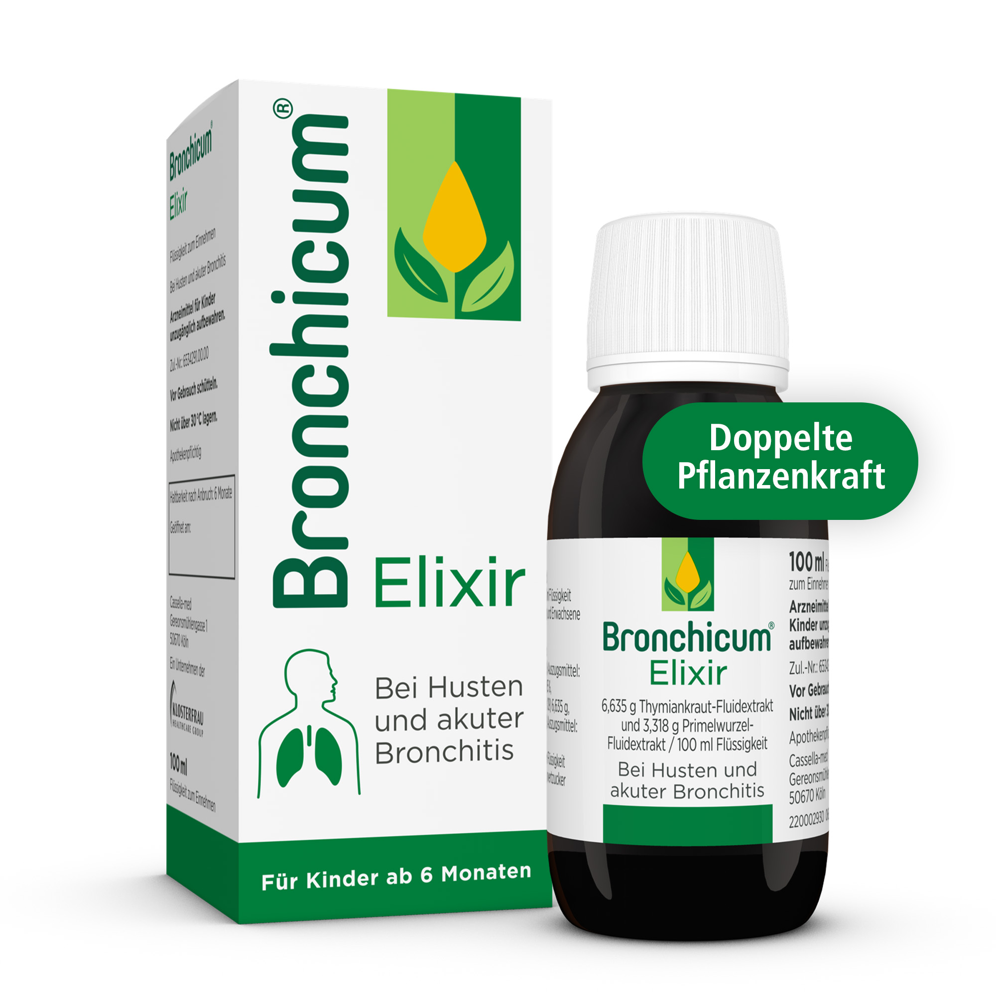 Bronchicum® Elixir hilft, den Schleim zu lösen und so die gereizten Bronchien zu beruhigen. Bronchicum® ist rein pflanzlich und sehr gut verträglich.