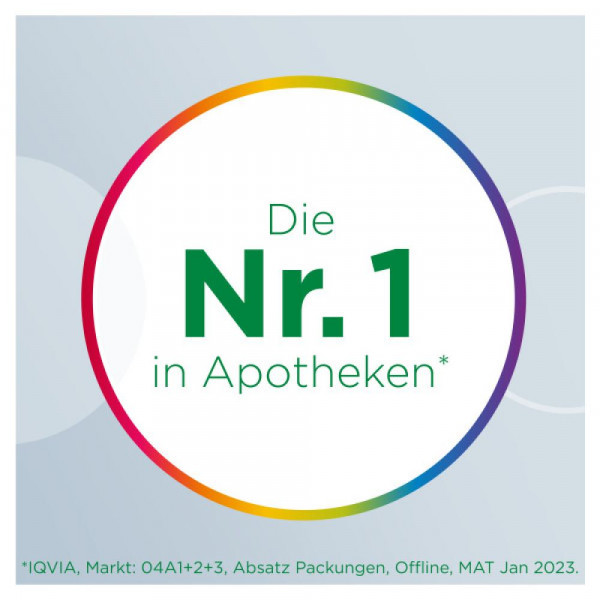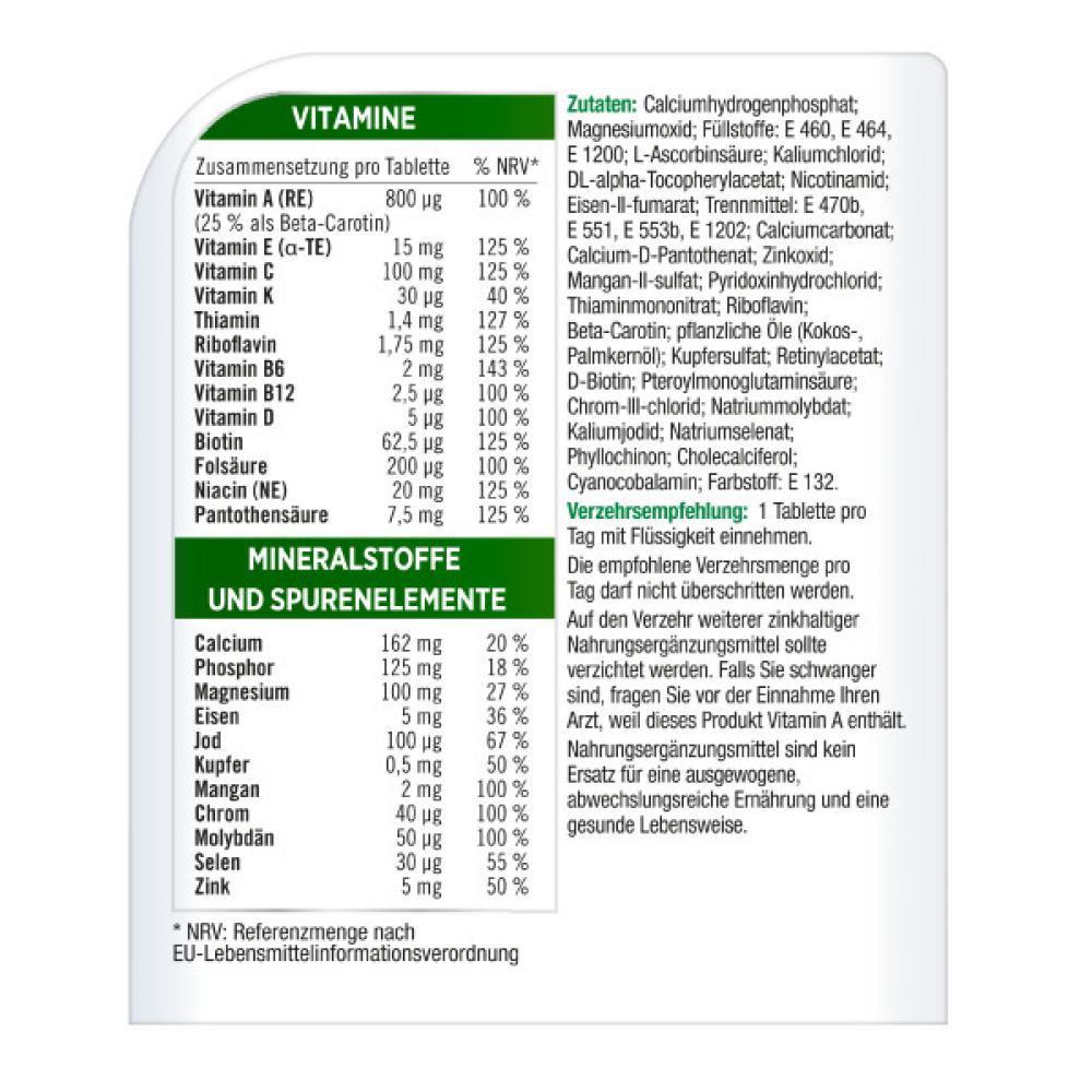 Zusammensetzung: Mikronährstoffe pro Tablette % NRV[*] Vitamin A (RE) (25% als Beta-Carotin) 800 µg 100 % Vitamin E (α-TE) 15 mg 125 % Vitamin C 100 mg 125 % Vitamin K 30 µg 40 % Thiamin 1,4 mg 127 % Riboflavin 1,75 mg 125 % Vitamin B6 2 mg 143 % Vitamin B12 2,5 µg 100 % Vitamin D 5 µg 100 % Biotin 62,5 µg 125 % Folsäure 200 µg 100 % Niacin (NE) 20 mg 125 % Pantothensäure 7,5 mg 125 % Calcium 162 mg 20 % Phosphor 125 mg 18 % Magnesium 100 mg 27 % Eisen 5 mg 36 % Jod 100 µg 67 % Kupfer 500 µg 50 % Mangan 2 mg 100 % Chrom 40 µg 100 % Molybdän 50 µg 100 % Selen 30 µg 55 % Zink 5 mg 50 % * NRV: Referenzmenge nach EU-Lebensmittelinformationsverordnung.
