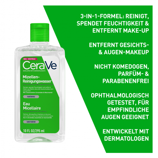 CeraVe Mizellen-Reinigungswasser: feuchtigkeitsspendende, sanfte Gesichtsreinigung für alle Hauttypen Das Mizellen-Reinigungswasser von CeraVe befreit die Gesichtshaut zuverlässig von Make-up, auch Augen-Make-up, reinigt dabei sanft die Haut und unterstützt die Hautschutzbarriere. Beruhigendes Mizellen Gesichtswasser Die Reinigung von CeraVe mit Mizellenwasser verbindet Gesichtsreinigung mit sanfter Pflege, die die Haut nicht austrocknet. Die Formel mit Niacinamid spendet intensiv Feuchtigkeit und wirkt hautberuhigend. Drei essenzielle Ceramide unterstützen die natürliche Funktion der Hautschutzbarriere.