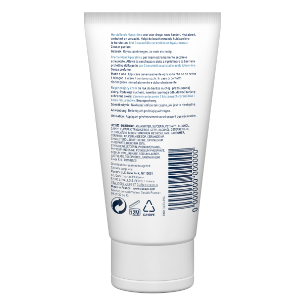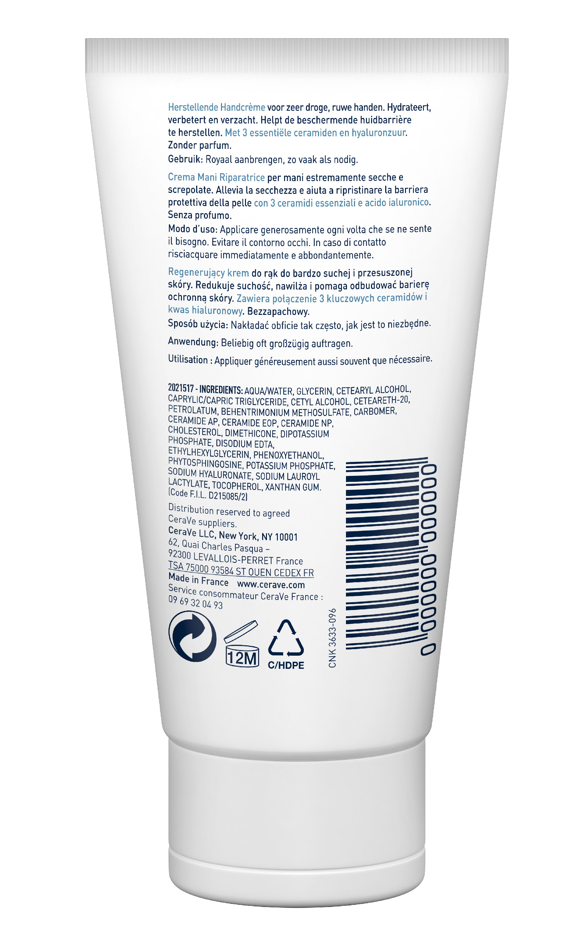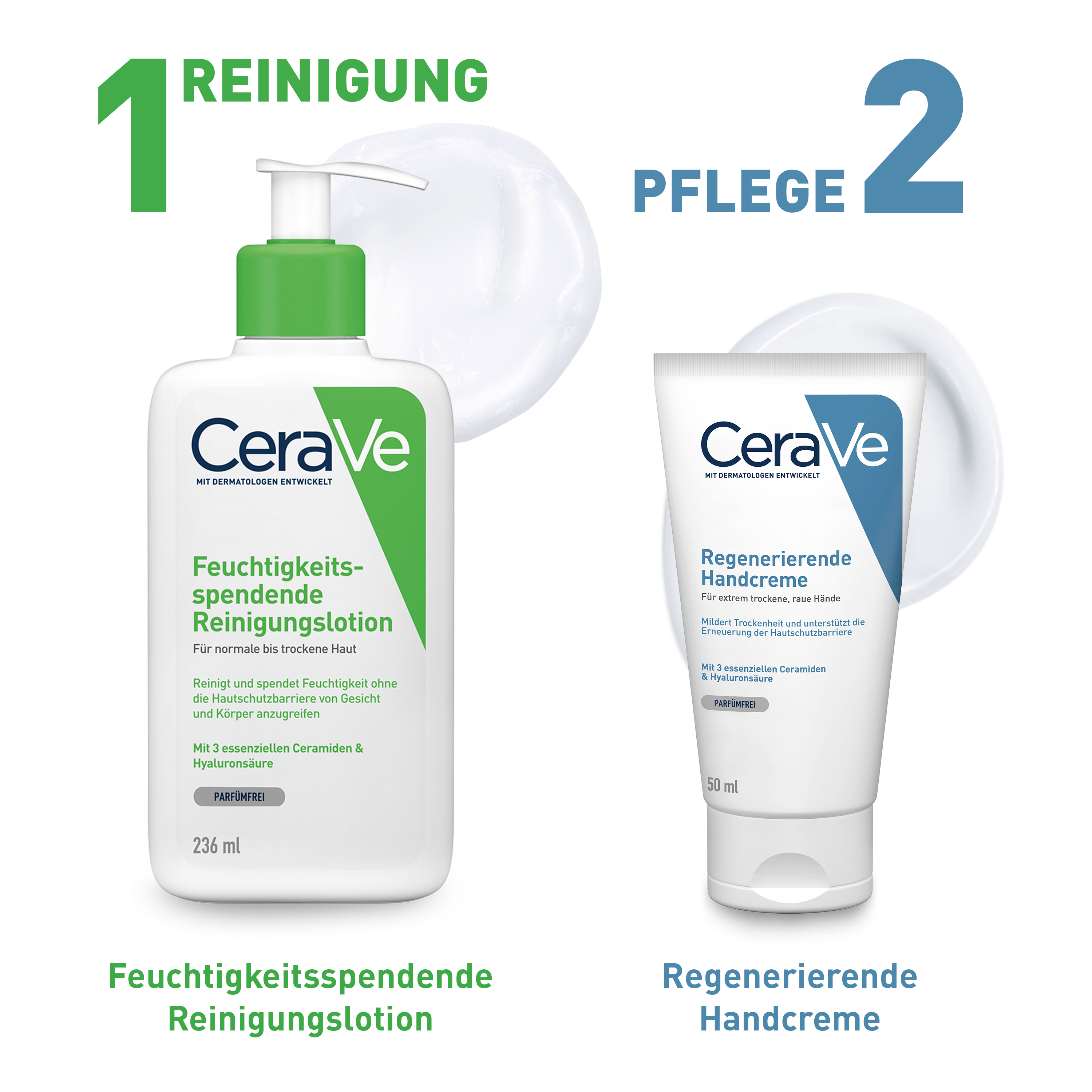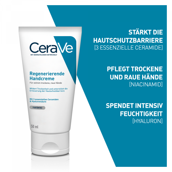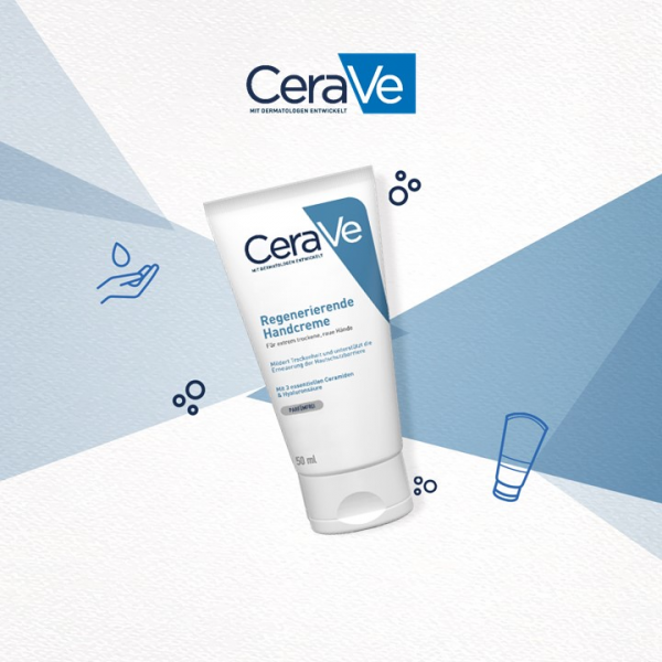 CeraVe Regenerierende Handcreme enthält eine Kombination aus drei essenziellen Ceramiden 1, 3 und 6-II, die die besonders angegriffenen und trockenen Hände beim Aufbau einer gesunden Hautschutzbarriere unterstützt. Die aktiven Wirkstoffe wie Ceramide und Hyaluron werden durch die patentierte Wirkstoff-Freisetzung über den Tag freigesetzt und geben der trockenen Haut ihr Wohlbefinden zurück.