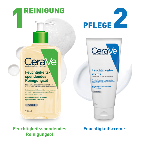 Täglich am Morgen und/oder am Abend eine kleine Menge des CeraVe Feuchtigkeitsspendendes Reinigungsöl aus dem Pumpspender entnehmen. Das Öl auf die leicht angefeuchtete Haut auftragen, in die Haut einmassieren und aufschäumen lassen. Anschließend mit lauwarmem Wasser abwaschen. Direkten Kontakt mit den Augen vermeiden. Dank seiner sanften Formel eignet sich das Reinigungsöl ohne Parfum auch für Babys ab dem 1. Lebensmonat, bei zu Neurodermitis neigender Haut und für Allergiker.