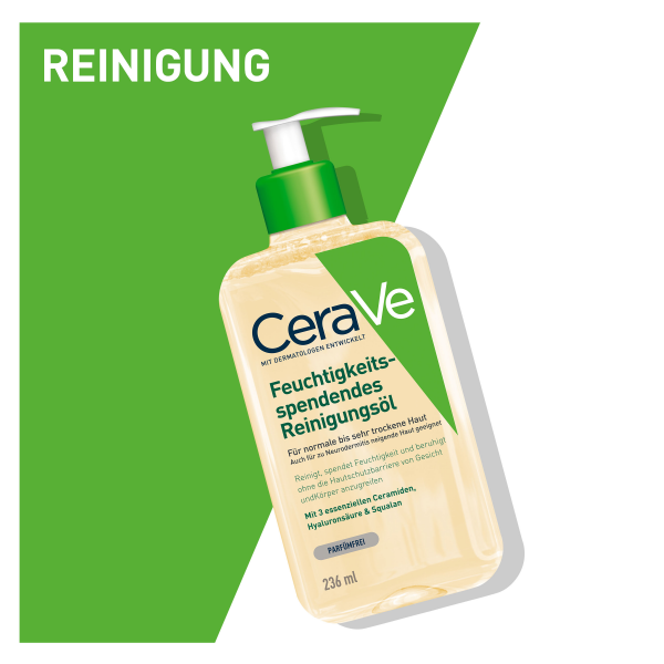 Reinigungsöl für normale bis sehr trockene Haut von Körper und Gesicht Das schäumende Reinigungsöl von CeraVe reinigt die Haut effektiv, spendet wertvolle Feuchtigkeit und schützt die natürliche Hautschutzbarriere. CeraVe Feuchtigkeitsspendendes Reinigungsöl ohne Duftstoff und Seife Die mit Dermatologen entwickelte Formel enthält rückfettendes Squalan, Triglyceride sowie Ceramide, die die Haut bereits ab der ersten Anwendung regenerieren und mit Feuchtigkeit versorgen. Der samtige Schaum, der beim Auftragen entsteht, entfernt selbst hartnäckiges Make-up und Schmutz, ohne die Haut auszutrocknen. Es eignet sich für die ganze Familie, für Allergiker sowie für zu Neurodermitis neigende Haut.