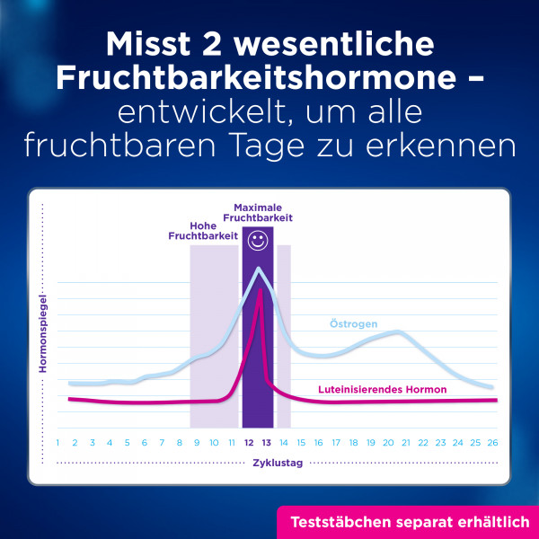 - Misst 2 wichtige Fruchtbarkeitshormone – entwickelt, um alle fruchtbaren Tage zu erkennen