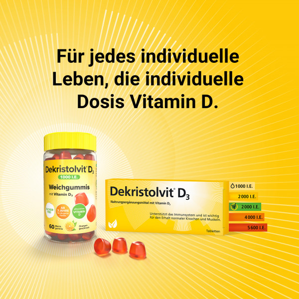Dekristolvit® ist erhältlich als Tropfen oder Weichgummis mit 1.000 I.E. Vitamin D, als Tabletten mit 2.000 I.E., 4.000 I.E. und 5.600 I.E. als Wochen-Depot, sowie als pflanzliche Kapseln. Dekristolvit® bietet somit für jedes individuelle Leben die individuelle Dosis Vitamin D.
