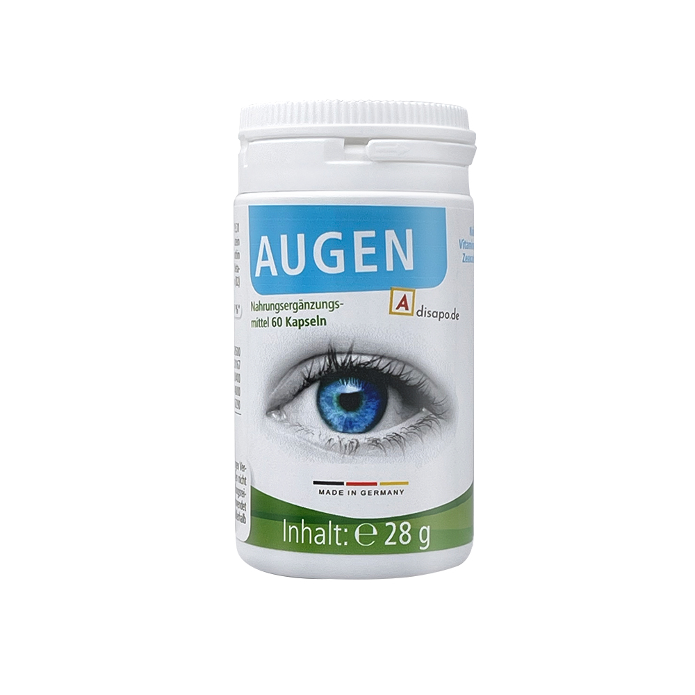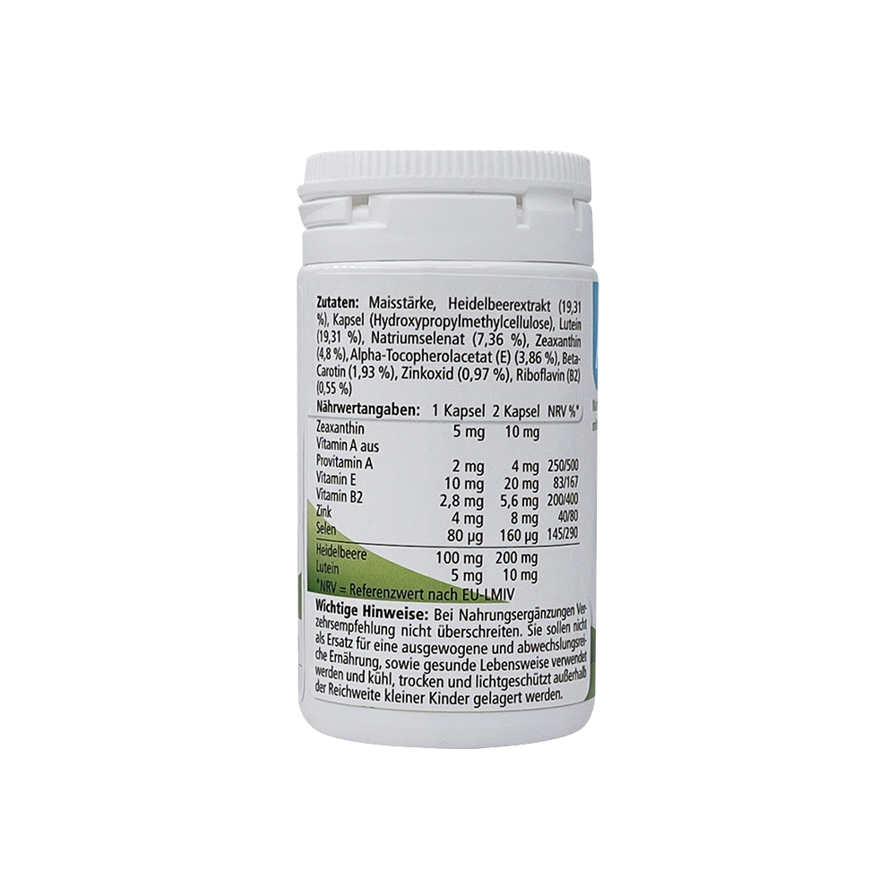Zusammensetzung/Kapsel: Maisstärke, Heidelbeerextrakt (19,31 %), Kapsel (Hydroxypropylmethylcellulose), Lutein (19,31 %), Natriumselenat (7,36 %), Zeaxanthin (4,8 %), Alpha-Tocopherolacetat (E) (3,86 %), Beta-Carotin (1,93 %), Zinkoxid (0,97 %), Riboflavin (B2) (0,55 %)