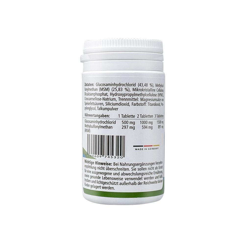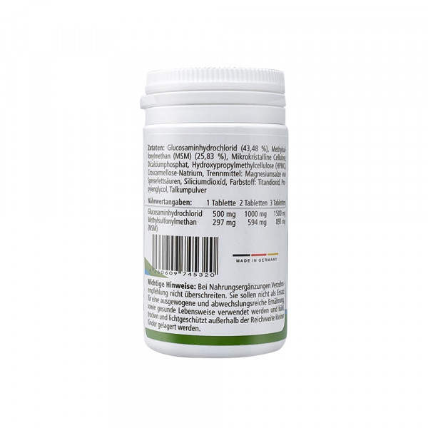 Glucosaminhydrochlorid (43,48 %), Methylsulfonylmethan (MSM) (25,83 %), Mikrokristalline Cellulose, Dicalciumphosphat, Hydroxypropylmethylcellulose (HPMC), Carboxymethylcellulose, Trennmittel: Magnesiumsalze von Speisefettsäuren, Siliciumdioxid, Farbstoff: Titandioxid, Propylenglycol, Talkumpulver