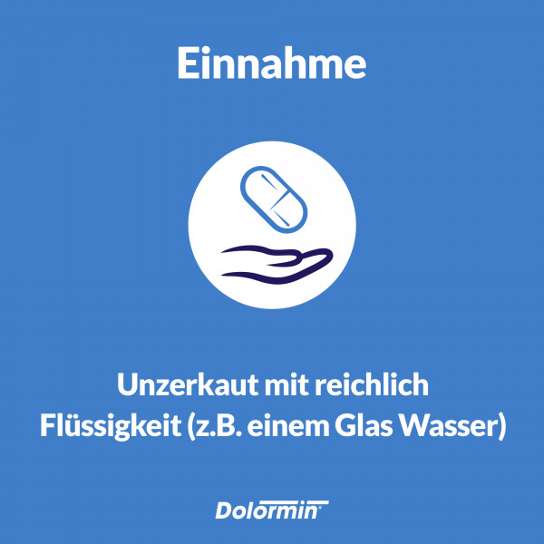 Nehmen Sie Dolormin® Schmerztabletten unzerkaut und mit reichlich Flüssigkeit ein. Leiden Sie unter einem empfindlichen Magen, empfiehlt es sich die Dolormin® Schmerztablette zu einer Mahlzeit einzunehmen.