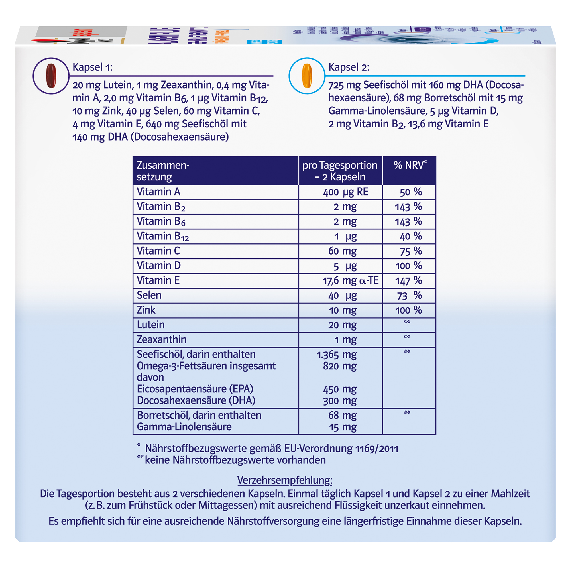 - Mit 820 mg Omega-3 Fettsäuren (davon 300 mg DHA und 450 mg EPA) und 400 µg Vitamin A pro Tagesportion (2 Kapseln) als Beitrag für den Erhalt der normalen Sehkraft