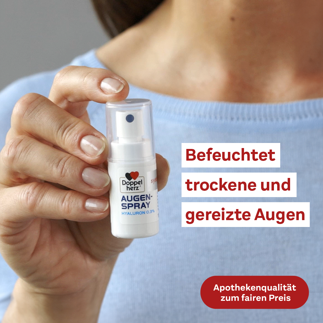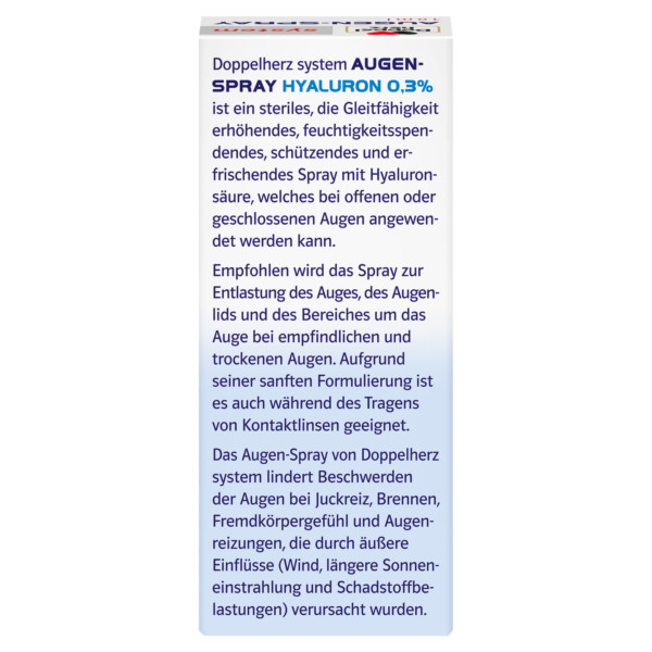 Doppelherz system AUGEN-SPRAY HYALURON 0,3% ist ein steriles isotonisches Augen-Feuchtigkeitsspray mit Hyaluronsäure. Es befeuchtet und erfrischt trockene und gereizte Augen. Für empfindliche Augen geeignet. Das Augen-Spray von Doppelherz system lindert Beschwerden der Augen bei Juckreiz, Brennen, Fremdkörpergefühl und Augenreizungen, die durch äußere Einflüsse (Wind, längere Sonneneinstrahlung und Schadstoffbelastungen) verursacht wurden.