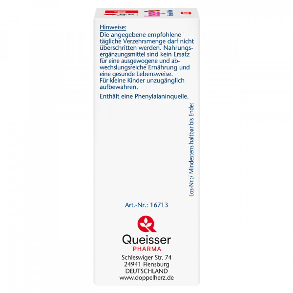 DoppelherzNahrungsergänzungsmittel sind kein Ersatz für eine ausgewogene und abwechslungsreiche Ernährung und eine gesunde Lebensweise. Die angegebene empfohlene tägliche Verzehrsmenge darf nicht überschritten werden. Außerhalb der Reichweite von kleinen Kindern aufbewahren.