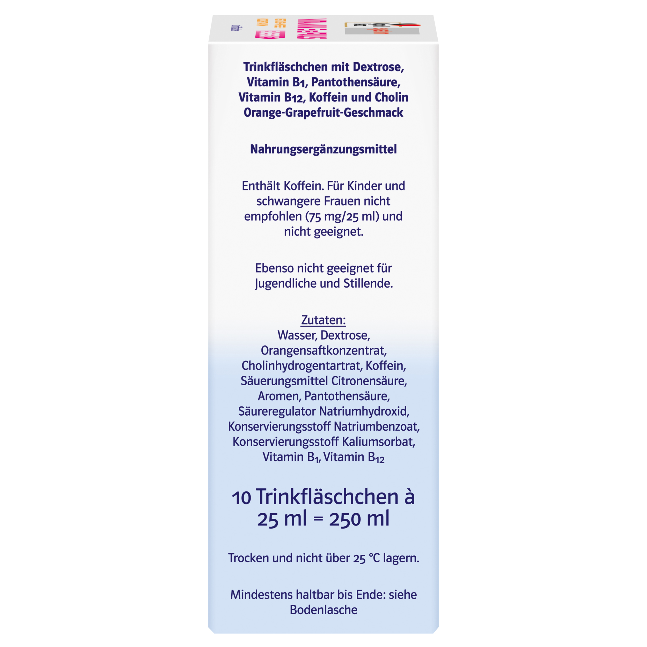 Doppelherz system VITAMIN B12 PLUS enthält 10 g Dextrose, 30 µg Vitamin B12, 75 mg Koffein, 100 mg Cholin, Vitamin B1 und Pantothensäure. Die aufeinander abgestimmten Nährstoffe sind im praktischen Trinkfläschchen enthalten – sofort trinkfertig mit leckerem Orange-GrapefruitGeschmack. Vitamin B12 unterstützt den normalen Energiestoffwechsel, trägt zur Verminderung von Erschöpfung und Müdigkeit bei und spielt für die Funktion des Nervensystems eine Rolle. Vitamin B1 trägt zum normalen Energiestoffwechsel bei und unterstützt die normale Funktion des Nervensystems. Pantothensäure leistet einen Beitrag zur normalen geistigen Leistungsfähigkeit, trägt zur Verminderung von Müdigkeit und Erschöpfung bei und spielt eine Rolle für den normalen Energiestoffwechsel. Koffein hilft, Aufmerksamkeit und Wachheit zu steigern und wirkt so geistiger Ermüdung entgegen. Es hilft, die Konzentration zu verbessern. Cholin ist eine fettähnliche Substanz, die für die Gesundheit wichtig ist und zum normalen Fettstoffwechsel beiträgt. Es ist Bestandteil von Phospholipiden, den Hauptbestandteilen der Zellmembranen und kommt daher in allen Körperzellen vor.