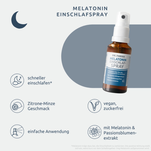 Ein erholsamer Schlaf bietet die Voraussetzung für einen guten Start in den Tag. Stressige Lebensphasen, Schicht- und Nachtarbeit oder lange Flugreisen über mehrere Zeitzonen hinweg, können zu Schlafproblemen führen. Dr. Theiss Melatonin Einschlaf-Spray kombiniert Melatonin mit Passionsblumenextrakt. Die positive Wirkung stellt sich ein, wenn kurz vor dem Schlafengehen 1 mg Melatonin aufgenommen wird. Melatonin trägt zur Linderung der subjektiven Jetlag-Empfindung bei. Die positive Wirkung stellt sich ein, wenn am ersten Reisetag kurz vor dem Schlafengehen sowie an den ersten Tagen nach Ankunft am Zielort mindestens 0,5 mg Melatonin aufgenommen werden. Das leicht anzuwendende Spray ist dank Sprühkopf einfach zu dosieren.