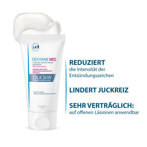 DEXYANE MED Creme - die S.O.S. Behandlung bei Ekzemen, behandelt, repariert und begrenzt das Wiederauftreten von Ekzemläsionen. Die ultra-feuchtigkeitsspendendeTextur garantiert Ihnen den Schutz Ihrer Haut und wirkt wie ein atmungsaktives Pflaster.