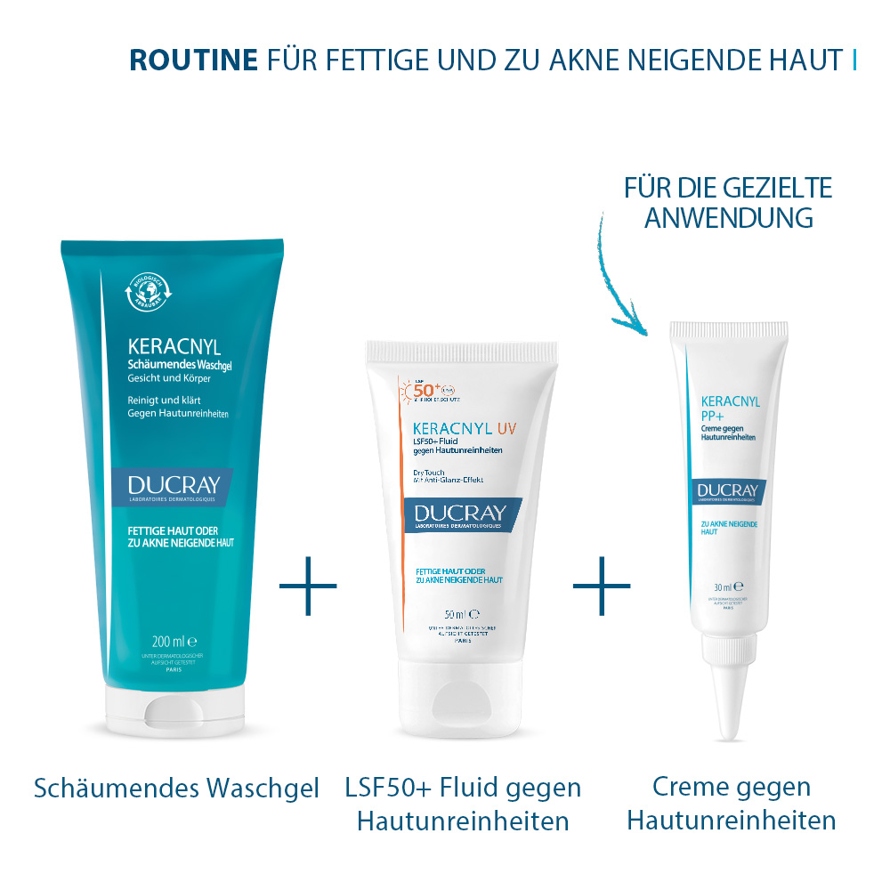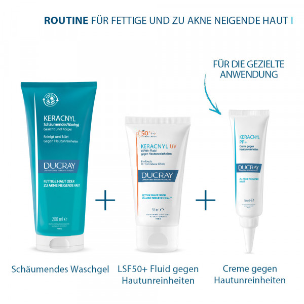 Keracnyl UV SPF 50+ Fluid gegen Hautunreinheiten bietet einen sehr hohen UVA-/UVB -Sonnenschutz für fettige oder zu Akne neigende Haut, und hilft Hautunreinheiten zu entfernen. Das Produkt ist für Jugendliche ab 12 Jahren und Erwachsene geeignet.