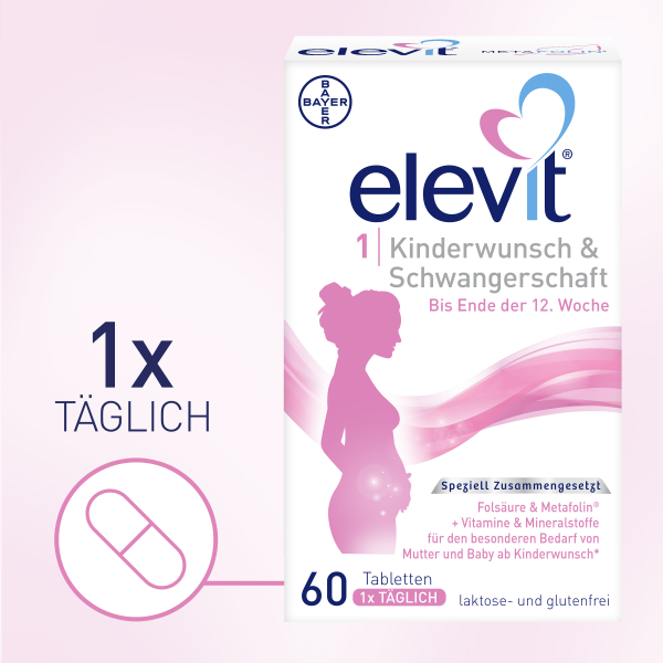 Ein Kind zu bekommen, klappt nicht immer auf Anhieb – manchmal dauert es bis sich eine Schwangerschaft einstellt. Mit Elevit 1 müssen Sie sich um die dafür benötigten Nährstoffe nicht mehr so viele Gedanken machen: Eine Tablette pro Tag unterstützt den erhöhten Nährstoffbedarf ab dem Kinderwunsch und im ersten Schwangerschaftsdrittel. Durch die Kombination von Metafolin®1 und Folsäure liefert es ausreichend Folat (800 Mikrogramm). Das ist besonders vorteilhaft für Frauen, deren Folsäure-Verwertung gestört ist, und reduziert das Risiko für Neuralrohrdefekte beim Baby. Der zusätzliche Vorteil: Elevit 1 ist frei von Laktose und Gluten.