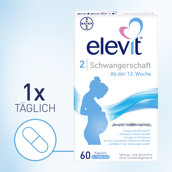 Elevit® 2 geht gezielt auf die Ansprüche der fortschreitenden Schwangerschaft ein. Der auf zwei Präparate aufgeteilte Wirkmechanismus ermöglicht eine durchgehende, jeweils gezielt auf die Schwangerschaftsphase abgestimmte Versorgung. Als zweiter Baustein des 2-Phasen Systems greift Elevit® 2 auf einen Vitamin- und Mineralstoffkomplex zurück, der speziell für das zweite und dritte Schwangerschaftstrimester und die Stillzeit konzipiert ist.