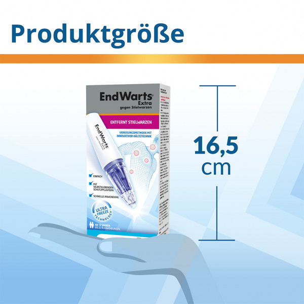EndWarts Extra gegen Stielwarzen ist ein effektives Mittel zur Selbstbehandlung von Stielwarzen an Hals, Brust, Achsel und Achselhöhle. Es ist das erste Mittel zur Selbstbehandlung von Stielwarzen mit Distickstoffmonoxid, einem Gas, das nach der Aktivierung des Geräts sehr kalt ist. Durch seine Ultra Freeze Technology wird eine Temperatur von etwa -80°C erreicht und die Stielwarze wirksam vereist. EndWarts Extra gegen Stielwarzen ist ein innovatives Produkt, das schnell und einfach anzuwenden ist. Mit seiner Präzisionsspitze und dem schützenden Schaumstoffpflaster ist die Vereisung mit EndWarts Extra gegen Stielwarzen einfach. Die umliegende Haut bleibt unbeeinträchtigt. Die Behandlung ist für Erwachsene über 18 Jahre geeignet.