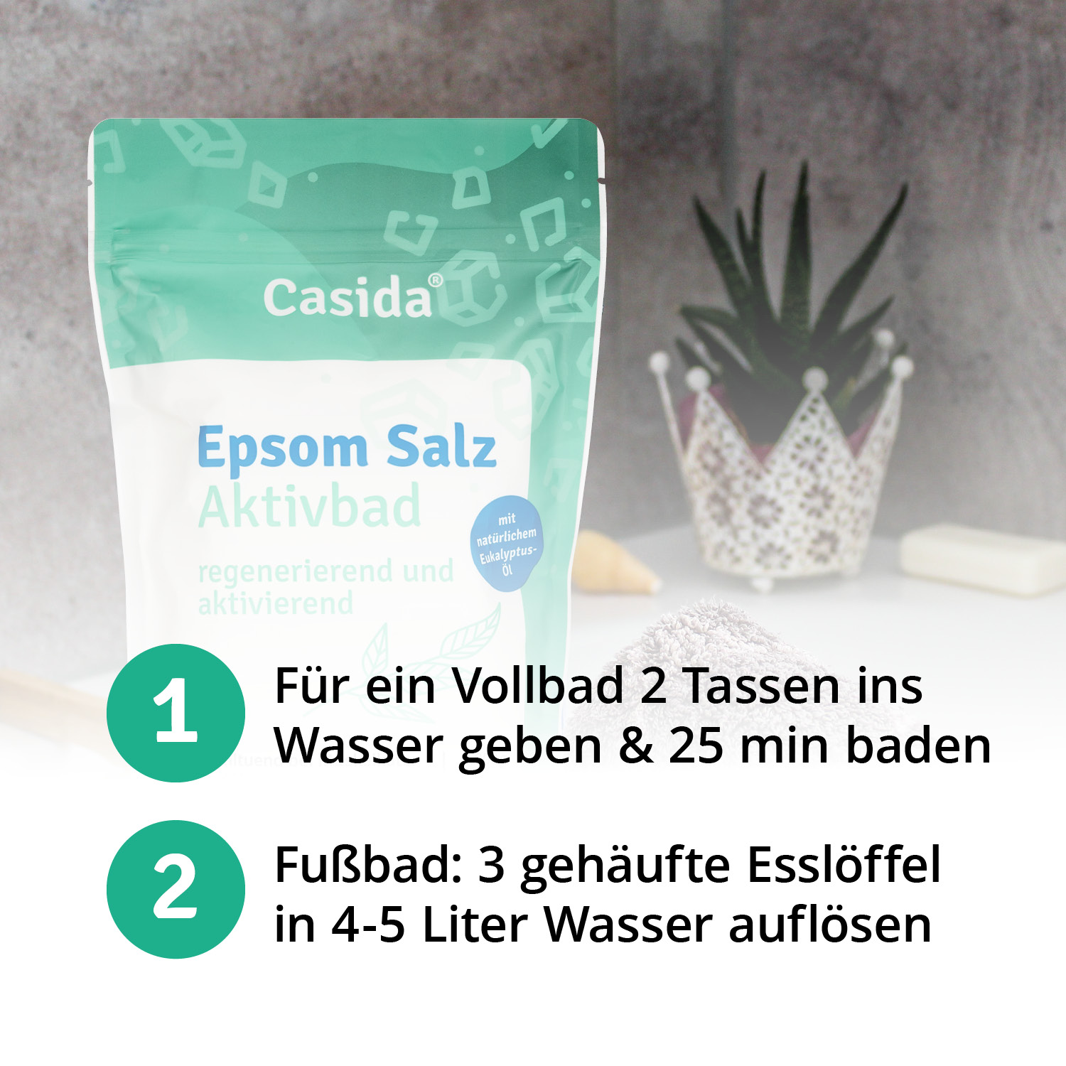 - Magnesiumreicher Badezusatz für Fuß- und Vollbäder.