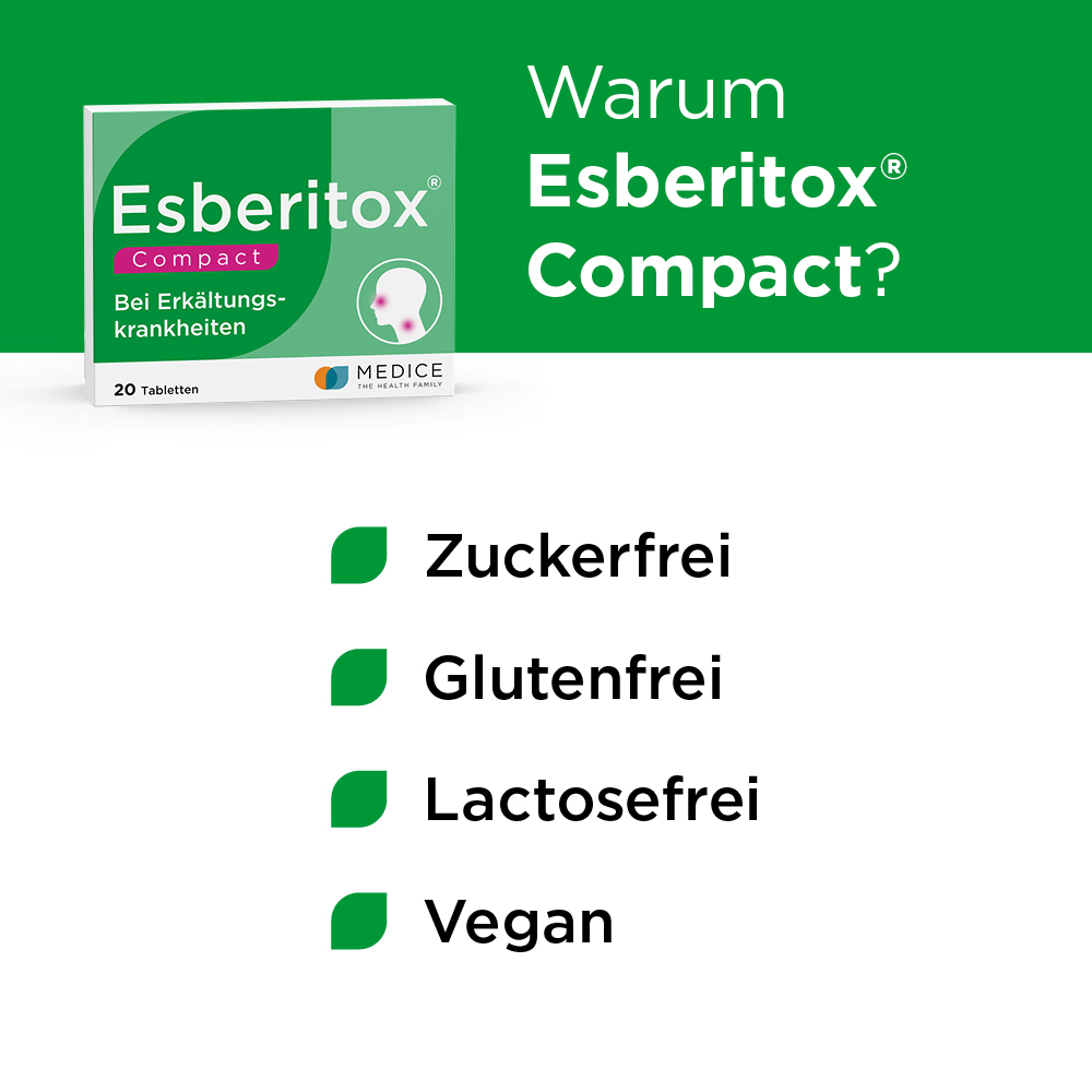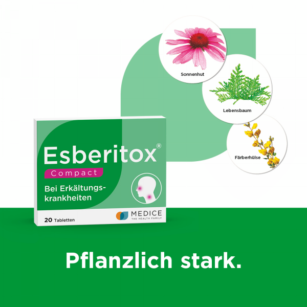 Esberitox®COMPACTist ein pflanzliches Arzneimittel bei Erkältungskrankheiten.Die moderne Forschung macht’s möglich: Esberitox COMPACT enthält den sogenannten Immun-Aktivkomplex von Esberitox in besonders hochkonzentrierter Form.In dem pflanzlichen Präparat der neuesten Generation mit wissenschaftlich belegter Wirksamkeit2 werden in einer genau festgelegten Rezeptur die Pflanzen-Wirkstoffe Lebensbaum, Färberhülse und Sonnenhut gemischt, schonend extrahiert und 5-fach konzentriert.Das Resultat: eine pflanzlich hochwirksame Kombination, die die antiviralen und immunstimulierenden Eigenschaften der drei Inhaltsstoffe vereint.Wissenschaftlich belegte WirksamkeitKlinische Studien mit Hunderten von Patienten haben die Wirksamkeit von Esberitox bestätigt: Die Erkältungsdauer wird um 2–3 Tage verkürzt Die Erkältungssymptome werden effektiv gelindert 2,3 Bitte befolgen Sie unsere Einnahmetipps, damit Esberitox COMPACT richtig wirken kann. Weitere Hinweise erhalten Sie auch in der Packungsbeilage von Esberitox COMPACT.1 16 mg Trockenextrakt aus pflanzlichen Wirkstoffen pro Tablette, i. Vgl. zu 3,2 mg Pflanzenextrakt in Esberitox Tabletten.2 Studie mit wirkstoffgleichem Produkt durchgeführt; Quelle: Henneicke-von Zepelin, H.-H., et al., Current Medical Research and Opinion, Vol. 15 (1999): 214-227.3 Naser B. et al., Phytomedicine 12(10) (2005): 715-722.Abklingen der Symptome des viralen AtemwegsinfektsWann, wie oft, wie viel:So nehmen Sie Esberitox COMPACT einBereits bei den ersten Anzeichen eingenommen – Hals- bzw. Rachenschmerzen, Niesen, laufender Nase, schmerzende Bronchien – hat Esberitox COMPACT den besten Effekt.Wichtig: Nehmen Sie Esberitox COMPACT immer auch zusätzlich zu symptomlindernden Schnupfensprays, Grippe-, Schmerz- und Hustenmitteln*. So kann die Erkältung schnell und gut auskuriert werden.*TIPP: Bei Husten empfehlen wir Ihnen die Kombination mit Esberi-Efeu Hustensaft!Dosierung:Erwachsene und Jugendliche ab 12 Jahren nehmen 3-mal täglich eine Tablette Esberitox COMPACT ein. Die Tabletten sollten morgens, mittags und abends mit ausreichend Flüssigkeit, vorzugsweise Wasser, eingenommen werden. Die Tabletten können auch gekaut werden. Für Menschen, die Probleme beim Schlucken von Tabletten haben, ist das eine große Erleichterung. Für das Kauen spricht auf jeden Fall der leckere und frische Zitronengeschmack. Weiteres Plus: Die Tabletten sind zucker- und lactosefrei.Produkt ProfilEsberitox COMPACT – das pflanzliche Präparat der neuesten Generation mit 5-fach konzentrierten1 Pflanzen-Wirkstoffen Wirkt ursächlich und bekämpft die Erkältungsviren direkt Mit dem Immun-Aktivkomplex aus Lebensbaum, Färberhülse und Sonnenhut Verkürzt die Erkältungsdauer um 2–3 Tage2 Lindert alle Symptome Zum Kauen und zur Einnahme mit Wasser geeignet Gluten-, Zucker- und Lactosefrei