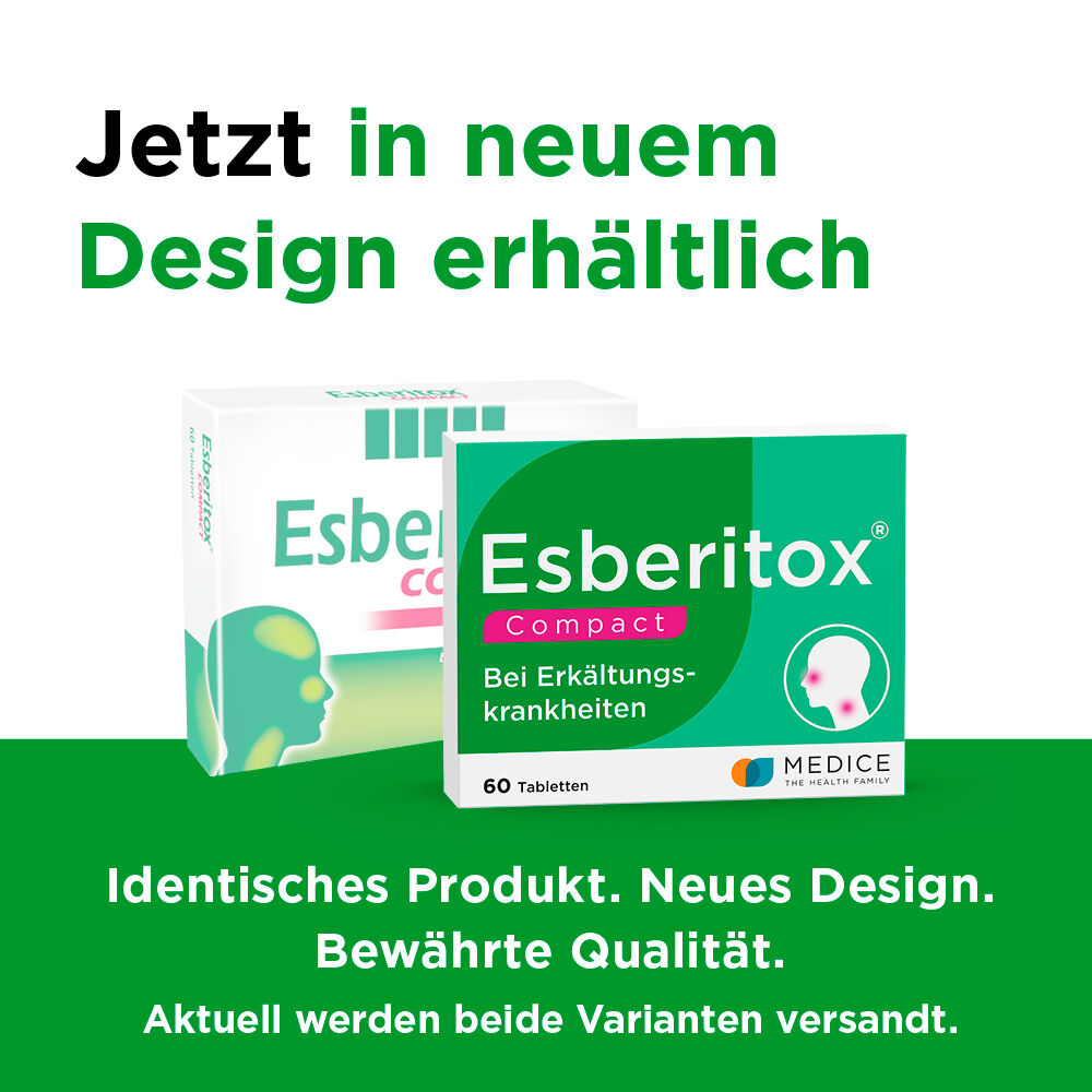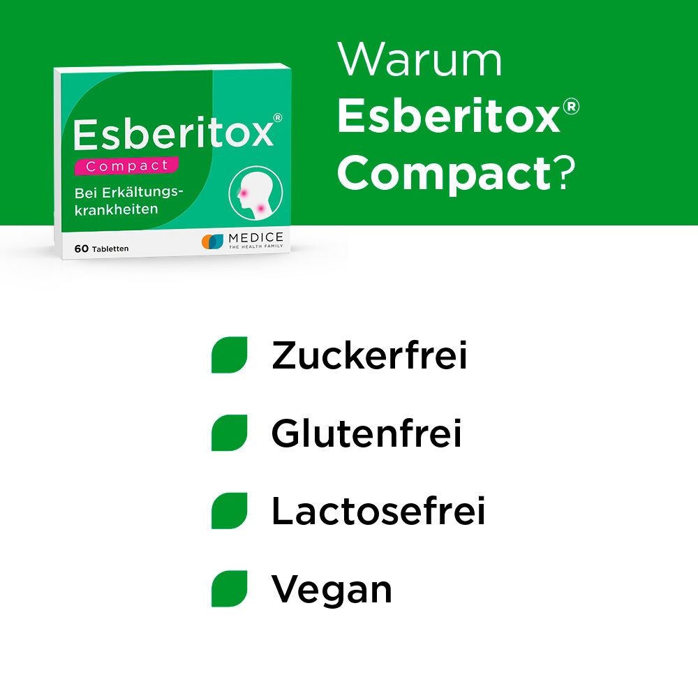 Esberitox®COMPACTist ein pflanzliches Arzneimittel bei Erkältungskrankheiten.Die moderne Forschung macht’s möglich: Esberitox COMPACT enthält den sogenannten Immun-Aktivkomplex von Esberitox in besonders hochkonzentrierter Form.In dem pflanzlichen Präparat der neuesten Generation mit wissenschaftlich belegter Wirksamkeit2 werden in einer genau festgelegten Rezeptur die Pflanzen-Wirkstoffe Lebensbaum, Färberhülse und Sonnenhut gemischt, schonend extrahiert und 5-fach konzentriert.Das Resultat: eine pflanzlich hochwirksame Kombination, die die antiviralen und immunstimulierenden Eigenschaften der drei Inhaltsstoffe vereint.Wissenschaftlich belegte WirksamkeitKlinische Studien mit Hunderten von Patienten haben die Wirksamkeit von Esberitox bestätigt: Die Erkältungsdauer wird um 2–3 Tage verkürzt Die Erkältungssymptome werden effektiv gelindert 2,3 Bitte befolgen Sie unsere Einnahmetipps, damit Esberitox COMPACT richtig wirken kann. Weitere Hinweise erhalten Sie auch in der Packungsbeilage von Esberitox COMPACT.1 16 mg Trockenextrakt aus pflanzlichen Wirkstoffen pro Tablette, i. Vgl. zu 3,2 mg Pflanzenextrakt in Esberitox Tabletten.2 Studie mit wirkstoffgleichem Produkt durchgeführt; Quelle: Henneicke-von Zepelin, H.-H., et al., Current Medical Research and Opinion, Vol. 15 (1999): 214-227.3 Naser B. et al., Phytomedicine 12(10) (2005): 715-722.Abklingen der Symptome des viralen AtemwegsinfektsWann, wie oft, wie viel:So nehmen Sie Esberitox COMPACT einBereits bei den ersten Anzeichen eingenommen – Hals- bzw. Rachenschmerzen, Niesen, laufender Nase, schmerzende Bronchien – hat Esberitox COMPACT den besten Effekt.Wichtig: Nehmen Sie Esberitox COMPACT immer auch zusätzlich zu symptomlindernden Schnupfensprays, Grippe-, Schmerz- und Hustenmitteln*. So kann die Erkältung schnell und gut auskuriert werden.*TIPP: Bei Husten empfehlen wir Ihnen die Kombination mit Esberi-Efeu Hustensaft!Dosierung:Erwachsene und Jugendliche ab 12 Jahren nehmen 3-mal täglich eine Tablette Esberitox COMPACT ein. Die Tabletten sollten morgens, mittags und abends mit ausreichend Flüssigkeit, vorzugsweise Wasser, eingenommen werden. Die Tabletten können auch gekaut werden. Für Menschen, die Probleme beim Schlucken von Tabletten haben, ist das eine große Erleichterung. Für das Kauen spricht auf jeden Fall der leckere und frische Zitronengeschmack. Weiteres Plus: Die Tabletten sind zucker- und lactosefrei.Produkt ProfilEsberitox COMPACT – das pflanzliche Präparat der neuesten Generation mit 5-fach konzentrierten1 Pflanzen-Wirkstoffen Wirkt ursächlich und bekämpft die Erkältungsviren direkt Mit dem Immun-Aktivkomplex aus Lebensbaum, Färberhülse und Sonnenhut Verkürzt die Erkältungsdauer um 2–3 Tage2 Lindert alle Symptome Zum Kauen und zur Einnahme mit Wasser geeignet Gluten-, Zucker- und Lactosefrei