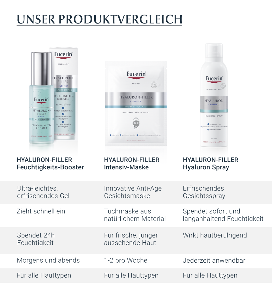 Anders als andere Gesichtssprays, die keine feuchtigkeitsspendenden Inhaltsstoffe enthalten, wirkt das Eucerin Hyaluron Spray mit den Inhaltsstoffen Hyaluronsäure und Glyceryl Glucoside. Hyaluronsäure kann Feuchtigkeit besonders gut speichern, um die Haut zu pflegen. Glyceryl Glucoside aktiviert die Feuchtigkeitsversorgung zwischen den Hautzellen unterstützt den Feuchtigkeitshaushalt der Haut von innen heraus. Die Feuchtigkeit kann so von der Haut gebunden werden und das Spray sorgt für ein glattes und strahlendes Hautgefühl. Das praktische Feuchtigkeitsspray kann jederzeit zur Gesichtspflege verwendet werden, wenn die Haut sich trocken anfühlt. Dabei ist das parfümfreie Spray ebenso für empfindliche Haut geeignet und zieht schnell ein.