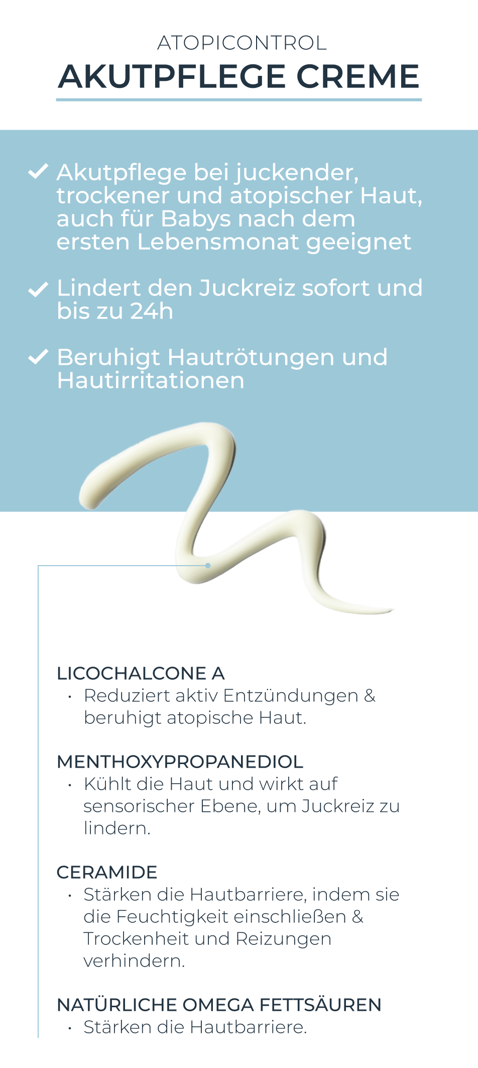 Der Aktiv-Pflege-Komplex kombiniert mehrere Wirkstoffe, um die Haut bestmöglich zu pflegen: Omega Fettsäuren regenerieren die Hautbarriere, Licocalcone A wirkt hautberuhigend und Decandiol wirkt antibakteriell. Die Formel mit Menthoxypropandiol lindert zudem den Juckreiz.