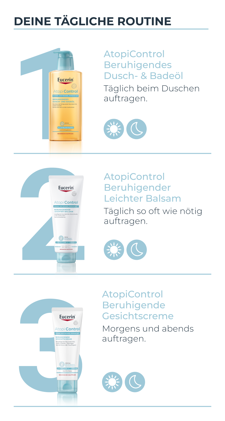 - Ergänzend kann das rückfettende AtopiControl Dusch- und Badeöl verwendet werden und in akuten Phasen die AtopiControl Akutpflege Creme