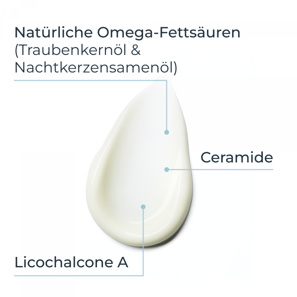 Aqua, Glycerin, Vitis Vinifera Seed Oil, Oenothera Biennis Oil, Caprylic/Capric Triglyceride, Cyclomethicone, Dimethicone, Pentaerythrityl Tetraisostearate, Triisostearin, Cetyl Alcohol, Glyceryl Stearate, PEG-40 Stearate, Glycyrrhiza Inflata Root Extract, Ceramid-3, Tocopherol, Citric Acid, Sodium Citrate, Ascorbyl Palmitate, BHT, 1,2-Hexanediol, Phenoxyethanol, Pirocton Olamin