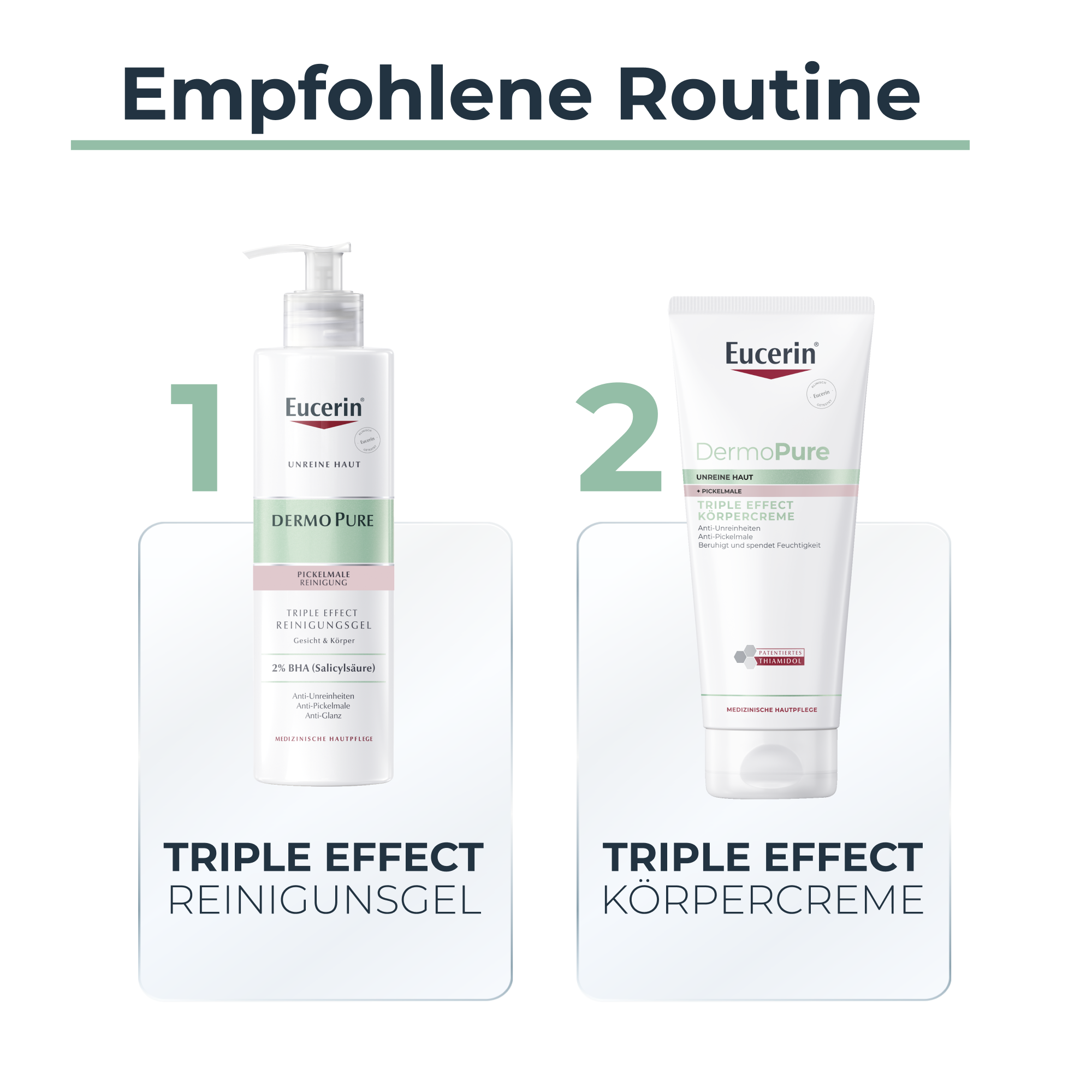 Die Eucerin DermoPure Triple Effect Körpercreme bei Akne kombiniert effektive Wirkstoffe für die Behandlung von Akne, mit denen Unreinheiten und Pickelmale reduziert werden und die Haut gleichzeitig beruhigt und mit Feuchtigkeit versorgt wird. Sie hat dabei drei Effekte: