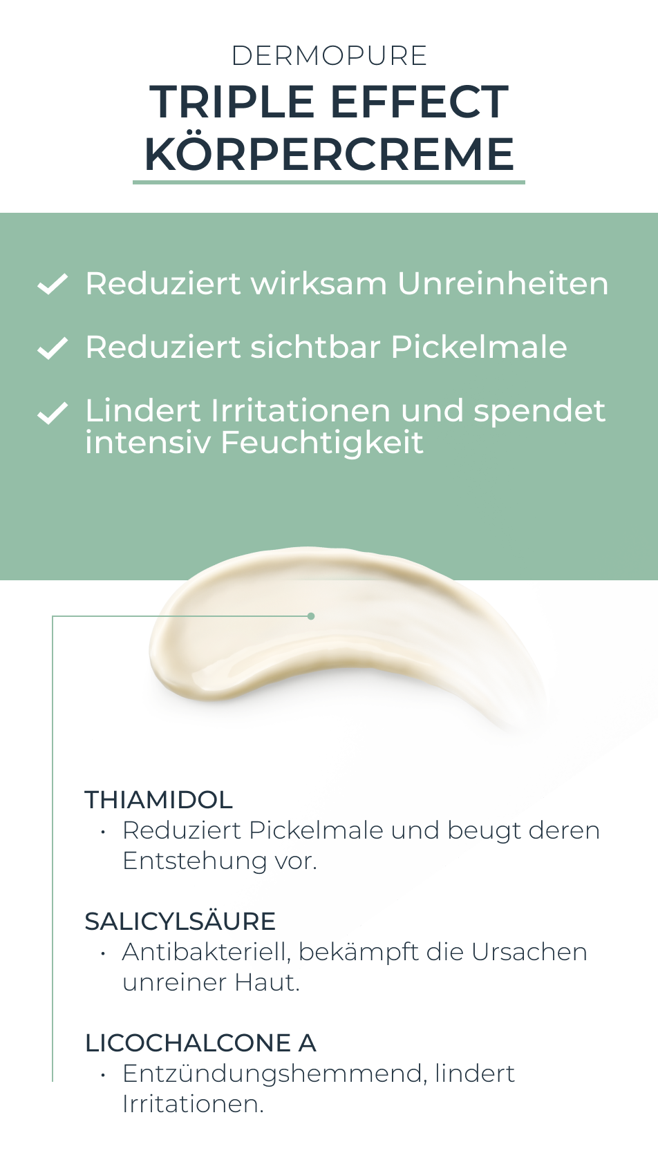 Anti-Unreinheiten: Als Salicylsäure Creme reduziert die Hautpflege wirksam hartnäckige Unreinheiten, durch patentiertes Thiadmidol® reduziert sie sichtbar Pickelmale und schützt vor ihrer Neuentstehung. Und als entzündungshemmende Creme mit Licocalcone A beruhigt sie Hautirritationen und reduziert Rötungen. Dank Glycerin ist die DermoPure Körpercreme eine ideale Feuchtigkeitscreme für den ganzen Körper.