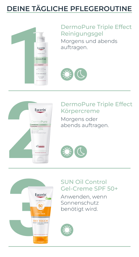 Pflege: Das zu verwendende Pflegeprodukt hängt von der Art der vorliegenden Akne und ihrer Therapie ab. Bei leichter bis zu mittelschwerer Körperakne, die nicht medikamentös therapiert wird, ist die DermoPure Triple Effect Körpercreme gegen Pickelmale und Unreinheiten zu empfehlen.