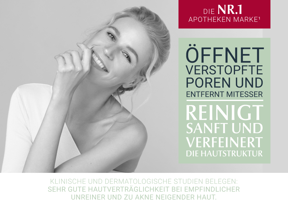 - Das Gesicht anschließend gut abspülen und eine geeignete Pflege auftragen, zum Beispiel Eucerin DermoPure Mattierendes Fluid