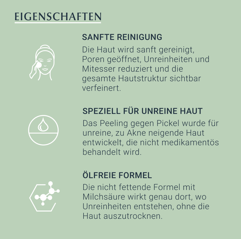Das Peeling gegen Pickel wurde für unreine, zu Akne neigende Haut entwickelt, die nicht medikamentös behandelt wird und kann auch während einer Schwangerschaft problemlos genutzt werden.