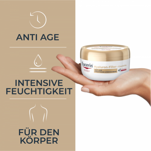 Pflege: Eine dünne Schicht der Eucerin Hyaluron Filler + Elasticity Anti-Age Straffende Körpercreme auftragen und sanft in die Haut einmassieren.  Für die besten Ergebnisse täglich morgens und abends anwenden, maximal 2 Anwendungen am Tag. Zusätzlich die Eucerin Hyaluron Filler + Elasticity Anti-Age Handcreme verwenden, um Altersflecken an den Händen zu mildern.